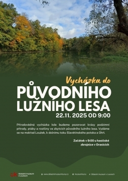 Přírodovědná vycházka kde budeme pozorovat krásy podzimní přírody, ptáky a rostliny ve zbytcích původního lužního lesa. Vydáme se na mokřad Loužek, k dolnímu toku Slavětínského potoka a Ohři.