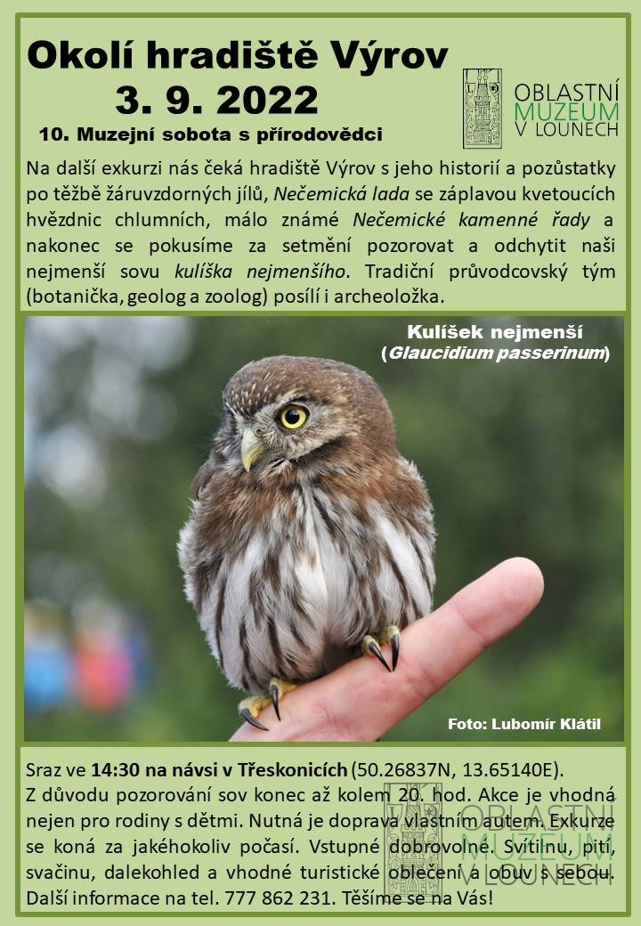 Na další exkurzi nás čeká hradiště Výrov s jeho historií a pozůstatky po těžbě žáruvzdorných jílů, Nečemická lada se záplavou kvetoucích hvězdnic chlumních, málo známé Nečemické kamenné řady a nakonec se pokusíme za setmění pozorovat a odchytit naši nejmenší sovu kulíška nejmenšího. Tradiční průvodcovský tým (botanička, geolog a zoolog) posílí i archeoložka. Sraz ve 14:30 na návsi v Třeskonicích (50.26837N, 13.65140E). Z důvodu pozorování sov konec až za tmy po 20. hod. Akce vhodná nejen pro rodiny s dětmi. Nutná je doprava vlastním autem. Exkurze se koná za jakéhokoliv počasí. Vstupné dobrovolné. Svítilnu, pití, svačinu, dalekohled a vhodné turistické oblečení a obuv s sebou. Další informace na tel. 777 862 231. Těšíme se na Vás!