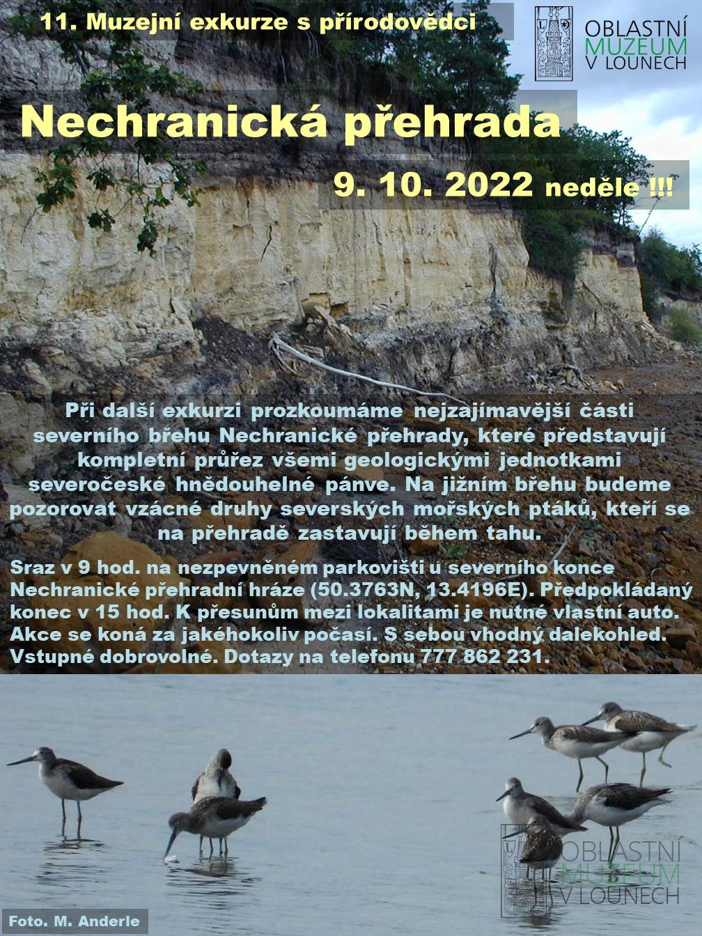 Při další exkurzi, která se netradičně uskuteční v neděli prozkoumáme nejzajímavější části severního břehu Nechranické přehrady, které představují kompletní průřez všemi geologickými jednotkami severočeské hnědouhelné pánve (možné zajímavé nálezy). Na jižním břehu budeme pozorovat vzácné druhy severských mořských ptáků, kteří se na přehradě zastavují během tahu. Sejdeme se netradičně v neděli 9. 10. 2022 v 9 hod. na hliněném parkovišti u severního konce Nechranické přehradní hráze (50.3763N, 13.4196E). Předpokládaný konec v 15 hod. K přesunům mezi lokalitami je nutné vlastní auto. Akce se koná za jakéhokoliv počasí. S sebou vhodné oblečení, obuv, svačinu a bude se hodit dalekohled. Vstupné dobrovolné. Dotazy na telefonu 777 862 231.