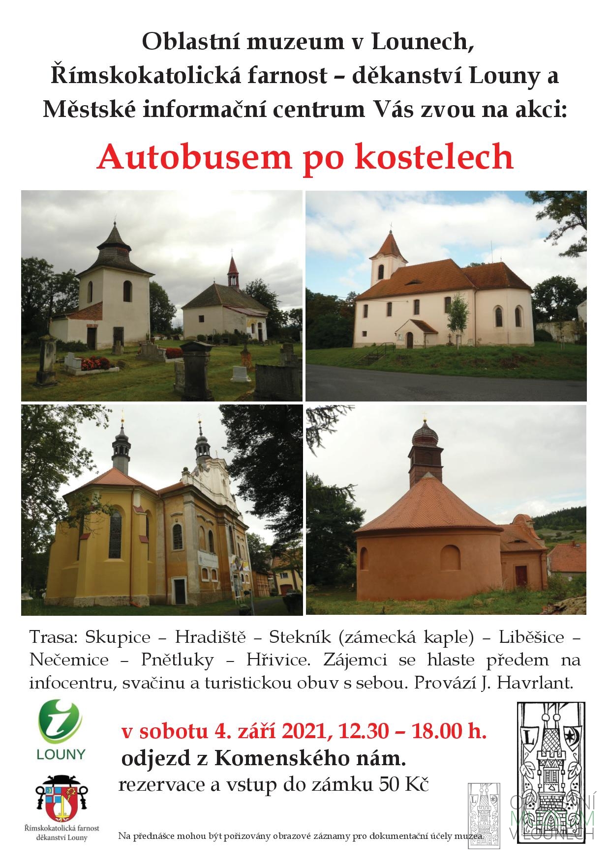 Sedmý ročník zájezdu, který dříve býval součástí Noci kostelů. Provází J. Havrlant ve spolupráci s Městským informačním centrem a lounskou farností. Trasa: Skupice – Hradiště – Stekník (zámecká kaple) – Liběšice – Nečemice – Pnětluky – Hřivice. Zájemci se hlaste předem na infocentru, svačinu a turistickou obuv s sebou. Rezervace a vstup do zámku 50 Kč. Odjezd je v sobotu 4. září ve 12:30 h. z Komenského nám. (naproti prodejny Billa). Předpokládaný návrat v 18 h.