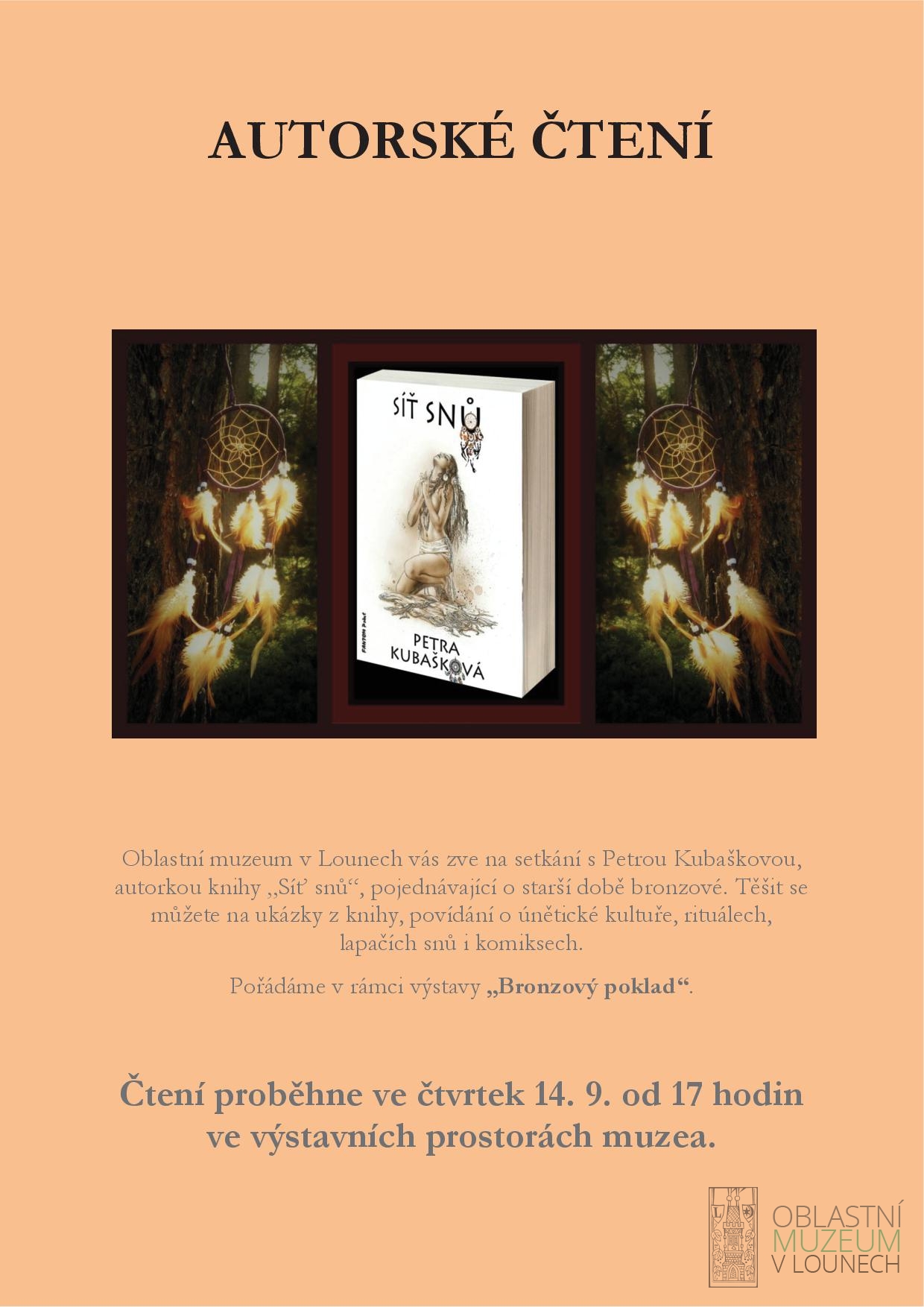 Oblastní muzeum v Lounech vás zve na setkání s Petrou Kubaškovou, autorkou knihy „Síť snů“, pojednávající o starší době bronzové. Těšit se můžete na ukázky z knihy, povídání o únětické kultuře, rituálech, lapačích snů i komiksech.