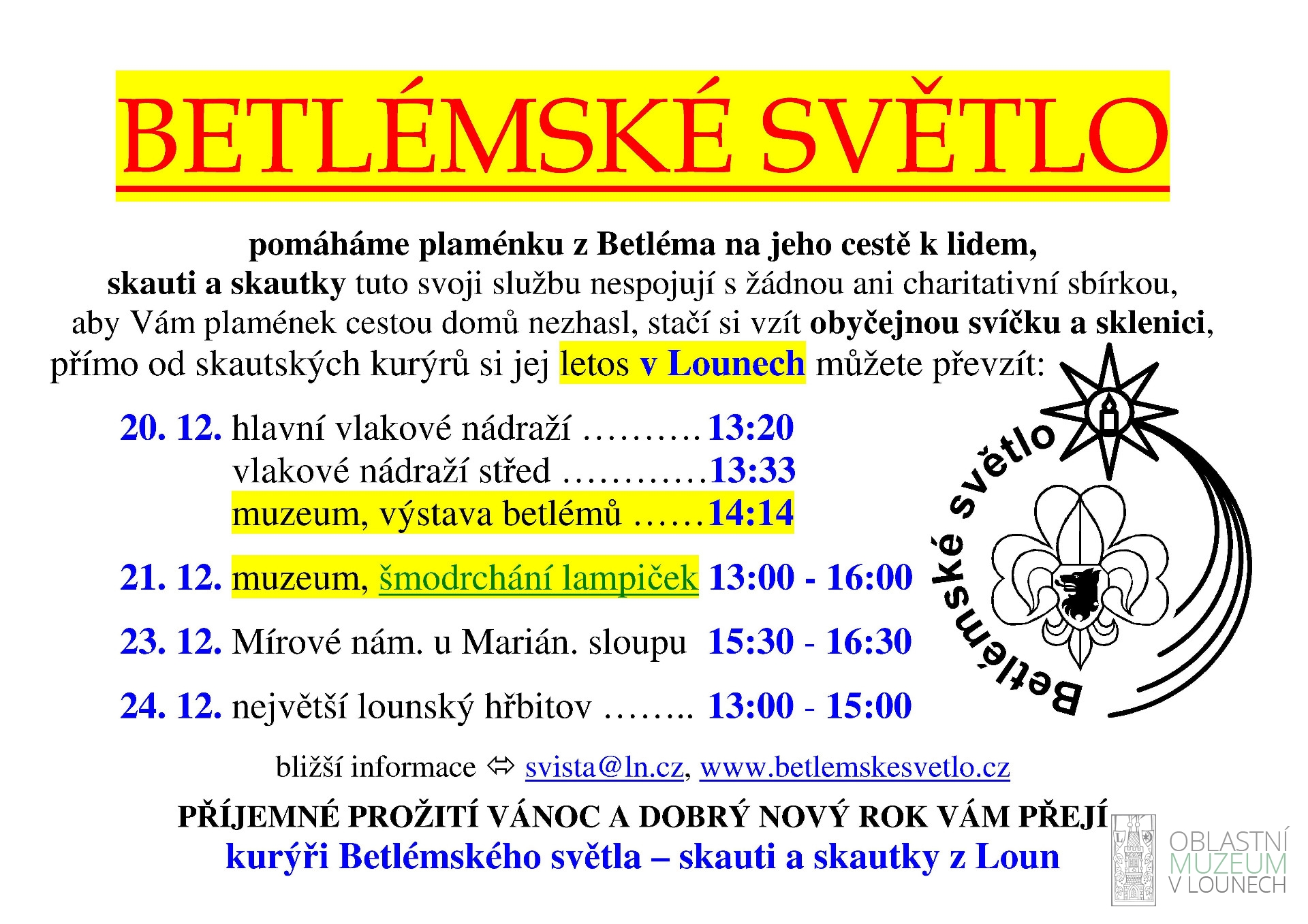 Jedním z prvních míst, kam lounští skauti přinesou Betlémské světlo, bude naše muzeum. Přijďte si odpoledne převzít plamének z Betléma.