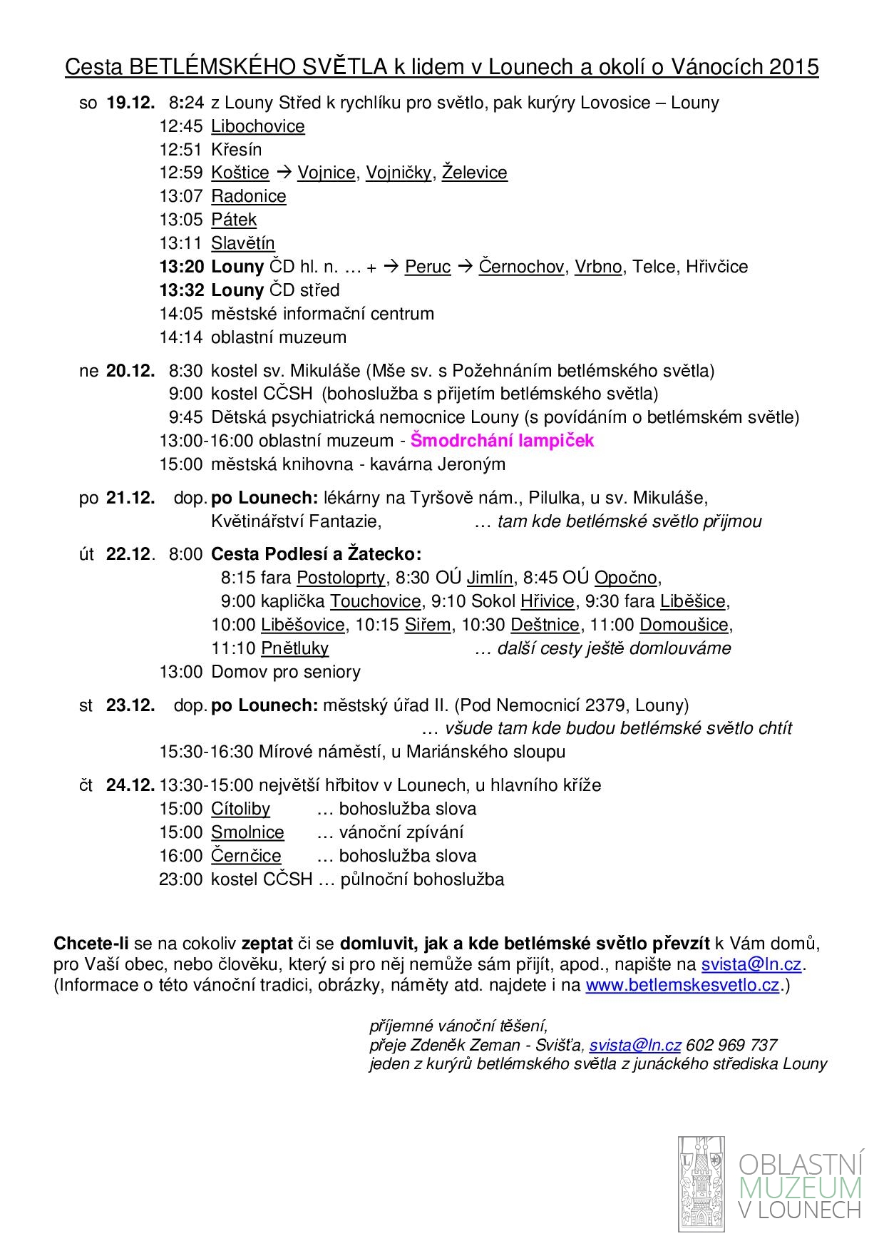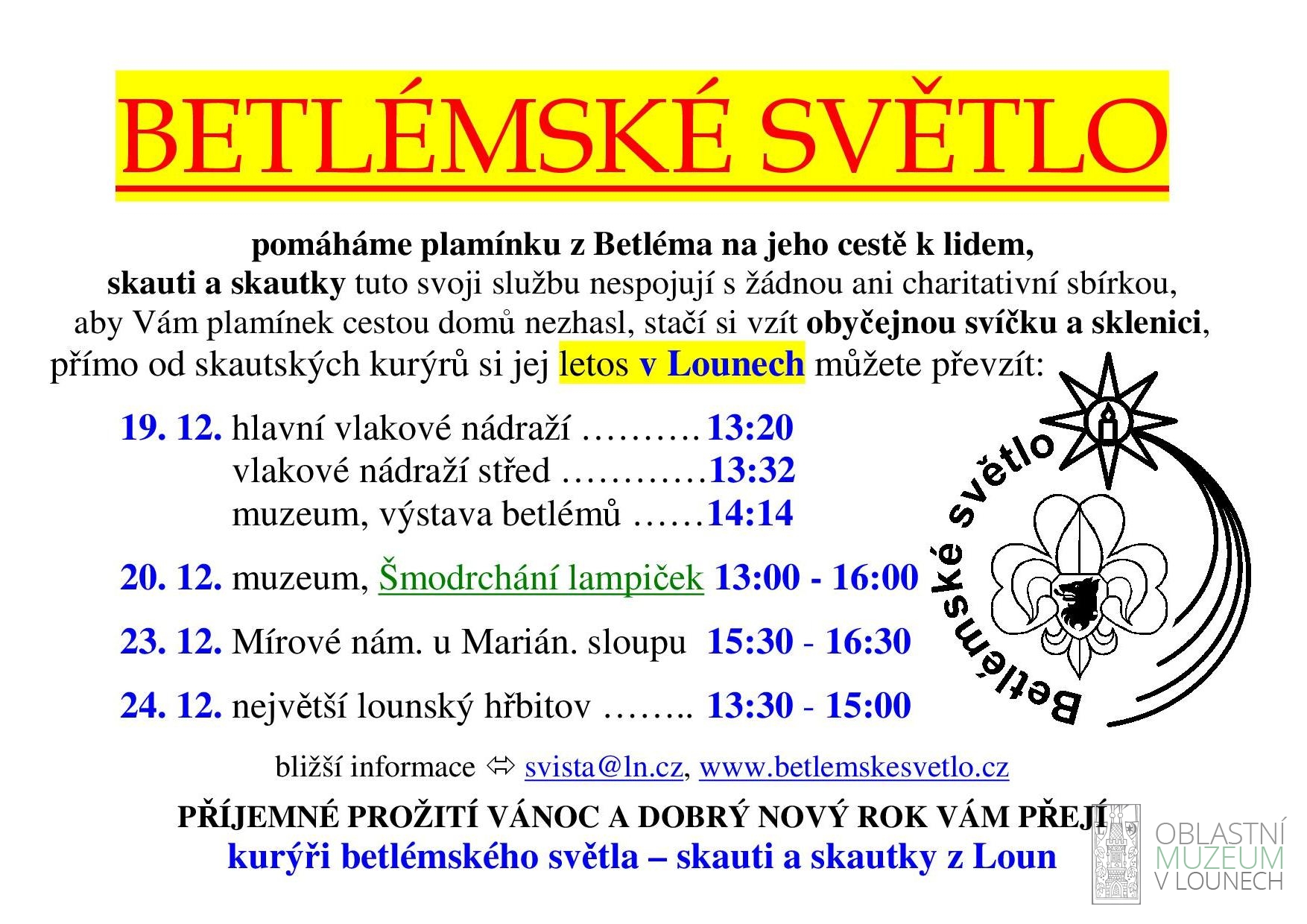 Do Loun přivezou štafetově předávaný plamínek z Betléma v sobotu 19.12. v 13:20 na hlavní vlakové nádraží. Dále si jej můžete převzít i na dalších místech a v různých dnech, viz přílohy. Jsou lidé, že plamínek převezmou od kurýrů přímo z vlaku, donesou domů a mají z něj radost až do Štědrého večera, Jsou lidé, že jej s uložením k spánku z obezřetnosti sfouknou, a pak si jej znovu přinesou až o Štědrý den z půlnoční i s radostnou novinou.
