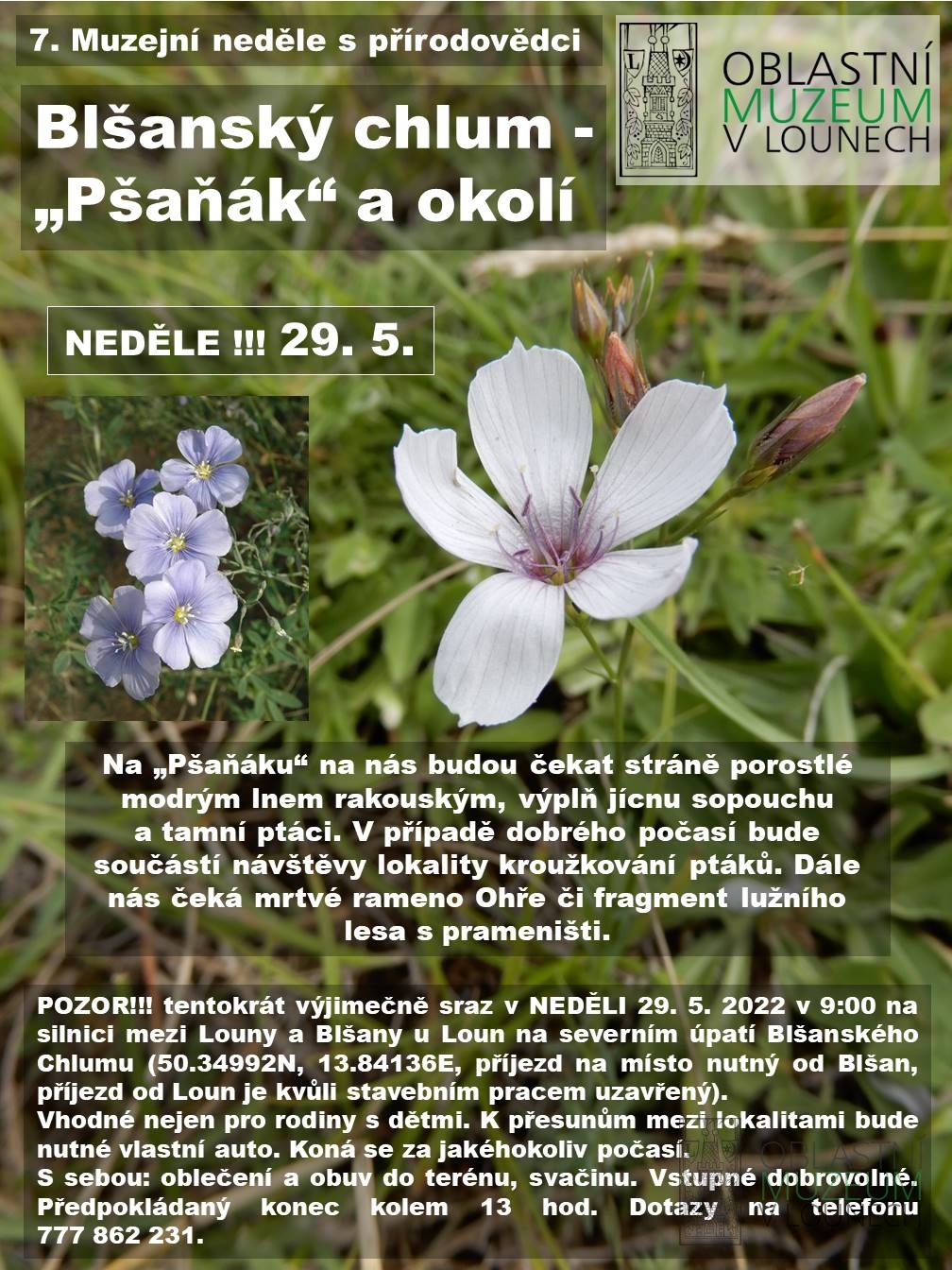 Na „Pšaňáku“ na nás budou čekat stráně porostlé modrým lnem rakouským, odkrytá výplň nálevkovitě se rozšiřujícího jícnu sopouchu tvořená vějířovitě uspořádanými, šestibokými sloupy čedičové horniny basanitu a možná i dudek. V případě dobrého počasí bude součástí návštěvy lokality kroužkování ptáků. Na Loužku u Počedělic nás bude čekat lužní les s železitými prameny a hnízda dravců. Navštívíme také nedaleké mrtvé rameno Ohře, které je zajímavým geologickým dokladem vývoje dolního toku Ohře a dynamiky říčního koryta. POZOR!!! tentokrát výjimečně sraz v NEDĚLI 29. 5. v 9:00 na silnici mezi Louny a Blšany u Loun na severním úpatí Blšanského Chlumu (50.34992N, 13.84136E, příjezd na místo nutný od Blšan, příjezd od Loun je kvůli stavebním pracem uzavřený). Vhodné nejen pro rodiny s dětmi. K přesunům mezi lokalitami bude nutné vlastní auto. Koná se za jakéhokoliv počasí. S sebou: oblečení a obuv do terénu, svačinu. Vstupné dobrovolné. Předpokládaný konec kolem 13 hod. Dotazy na telefonu 777 862 231.