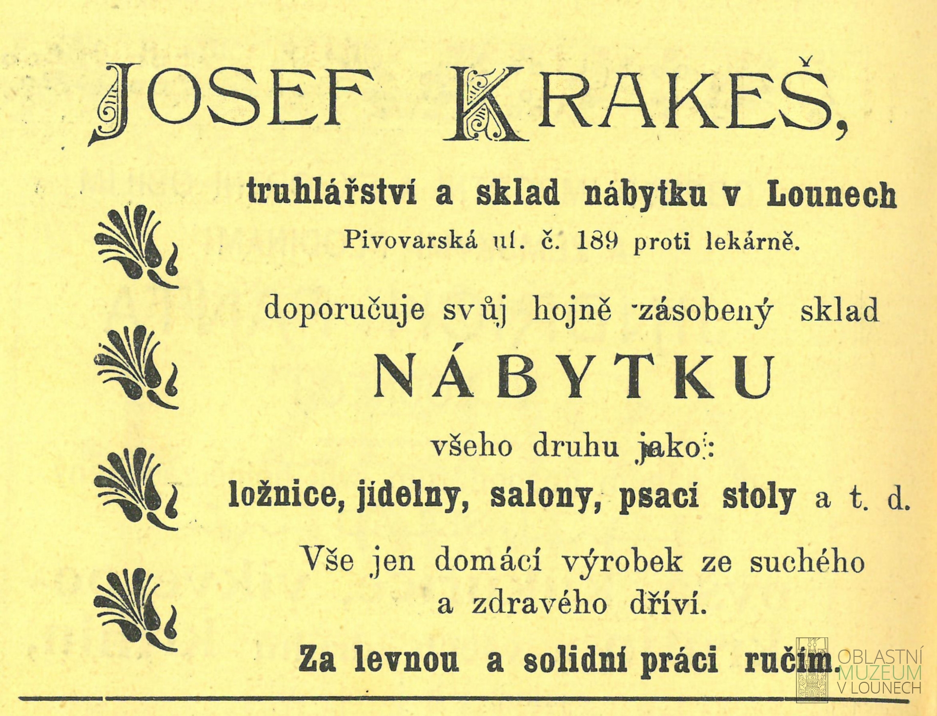 Již před rokem 1900 měl v domě prodejnu a sklad nábytku Josef Krakeš. Ten bydlel a své truhlářské řemeslo provozoval ve Sladovnické ulici čp. 21, kam se r. 1885 přiženil, když si vzal dceru lounského stavitele Emiliana Chládka (autora např. někdejšího cimbuří na Žatecké bráně). Po smrti Josefa Krakeše (†1918) se firmy ujal jeho syn Jaroslav, který roku 1923 středověký dům na Pivovarské 189 zásadně přestavěl a do průčelí v přízemí i v poschodí vsadil velká výkladní okna. Vytvořil nový vstup z ulice a do patra točité kovové schodiště. O deset let později rozšířil dílnu ve Sladovnické ulici zbouráním domů čp. 20, 21 a 22 a stavbou nové budovy s výrobnou a prodejnou nábytku i s byty. Dům čp. 189 pak sloužil jen jako sklad nábytku. Jeho výroba po válce ve znárodněné dílně skončila, prostory bývalé truhlárny připadly družstvu DRUTEP k výrobě hřebenů a koupelové soli, ale prodejna nábytku PRONA je zde dosud.