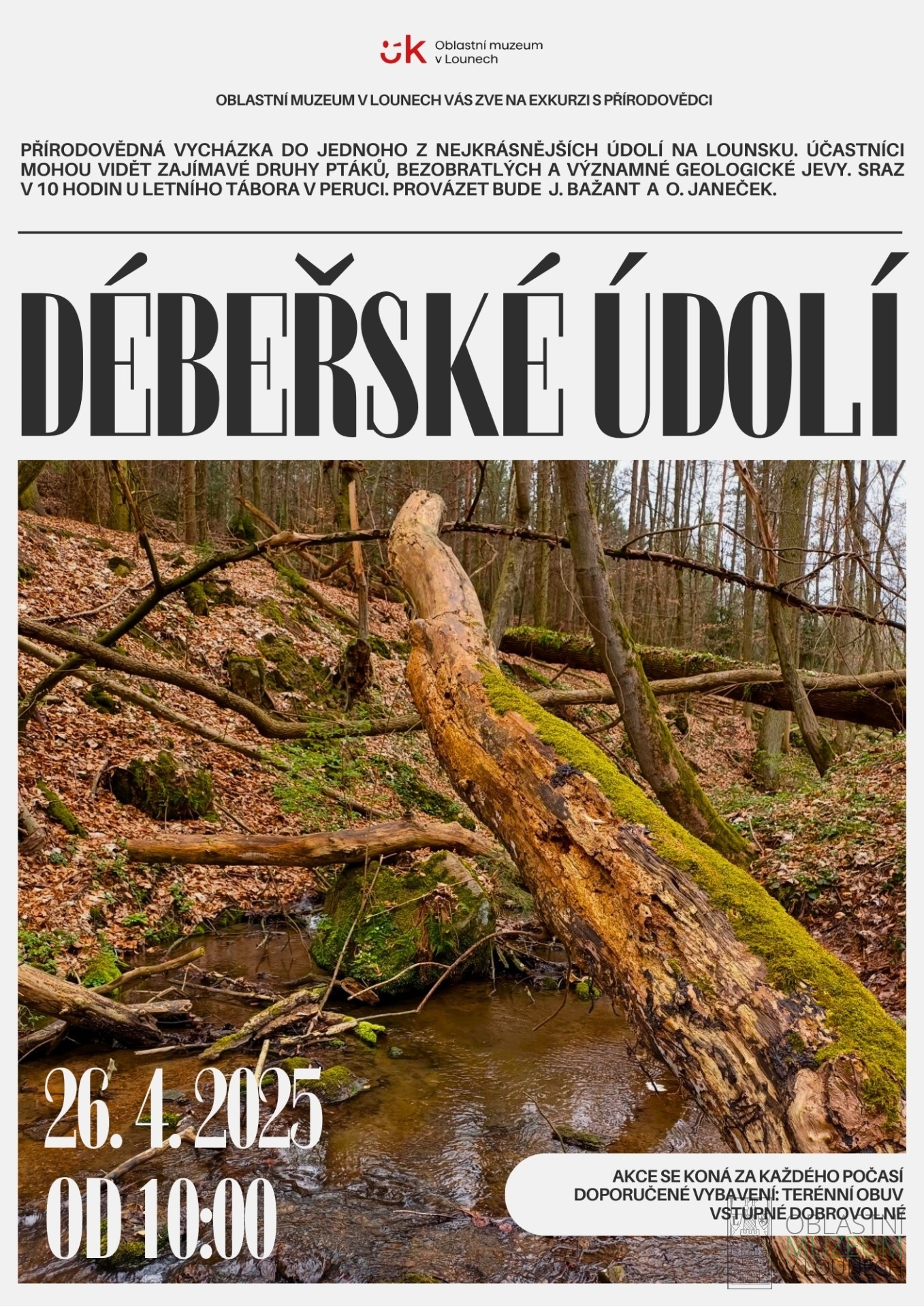 Přírodovědná vycházka do jednoho z nejkrásnějších údolí na Lounsku. Mohli bychom vidět různé ptáky, včetně ptáka roku 2025- konipase horského, obojživelníky, spoustu květin a významné geologické jevy.