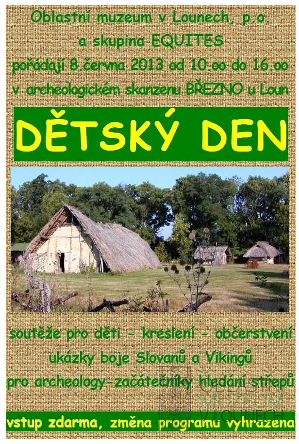 V sobotu 8. června pořádá muzeum dětský den v Archeologickém skanzenu Březno u Loun. Mezi 10. a 16. hod. předvedou členové skupiny EQUITES, jak bojovali staří Slované a Vikingové, připravené je hledání střepů pro archeology-začátečníky, soutěže pro děti i občerstvení. Vstup je zdarma, změna programu vyhrazena.