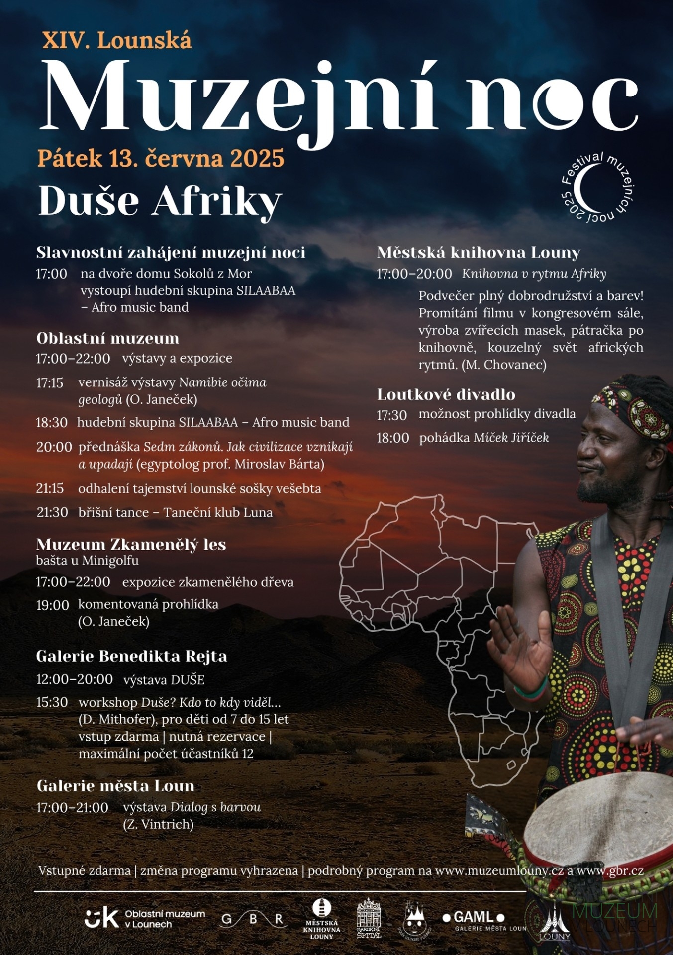 V pátek 13. června ožily Louny africkými rytmy, barvami a příběhy. Čtrnáctý ročník muzejní noci s podtitulem Duše Afriky nabídl bohatý program v muzeu, knihovně, galeriích, loutkovém divadle i ve Zkamenělém lese.
