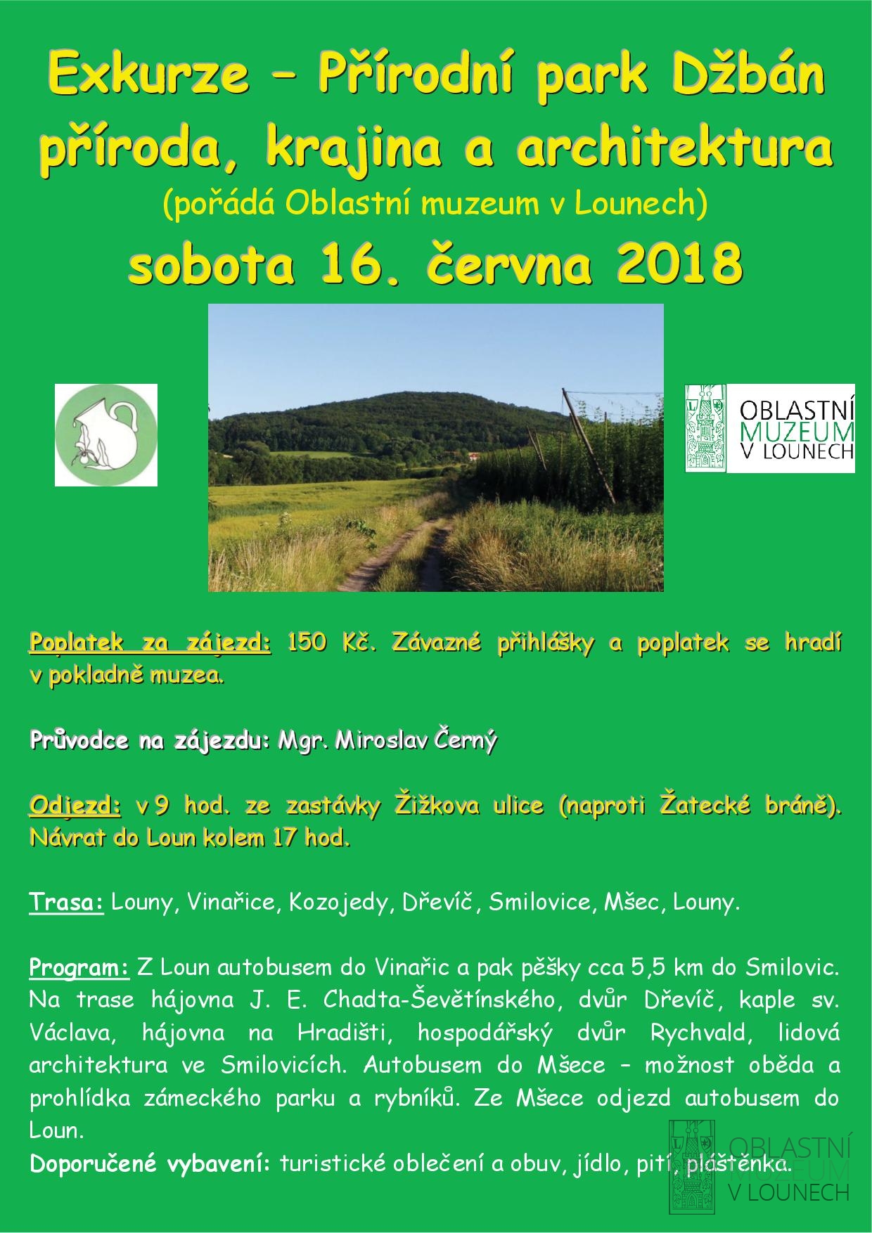 Exkurze navazující na výstavu Pahorkatina Džbán. Seznámení s přírodou, krajinou a architekturou PP Džbán v okolí Vinařic, Dřevíče, Smilovic a Mšece. Průvodce Mgr. Miroslav Černý. Podrobnosti a možnost přihlášení od května v pokladně muzea. Cena exkurze 150,- Kč.