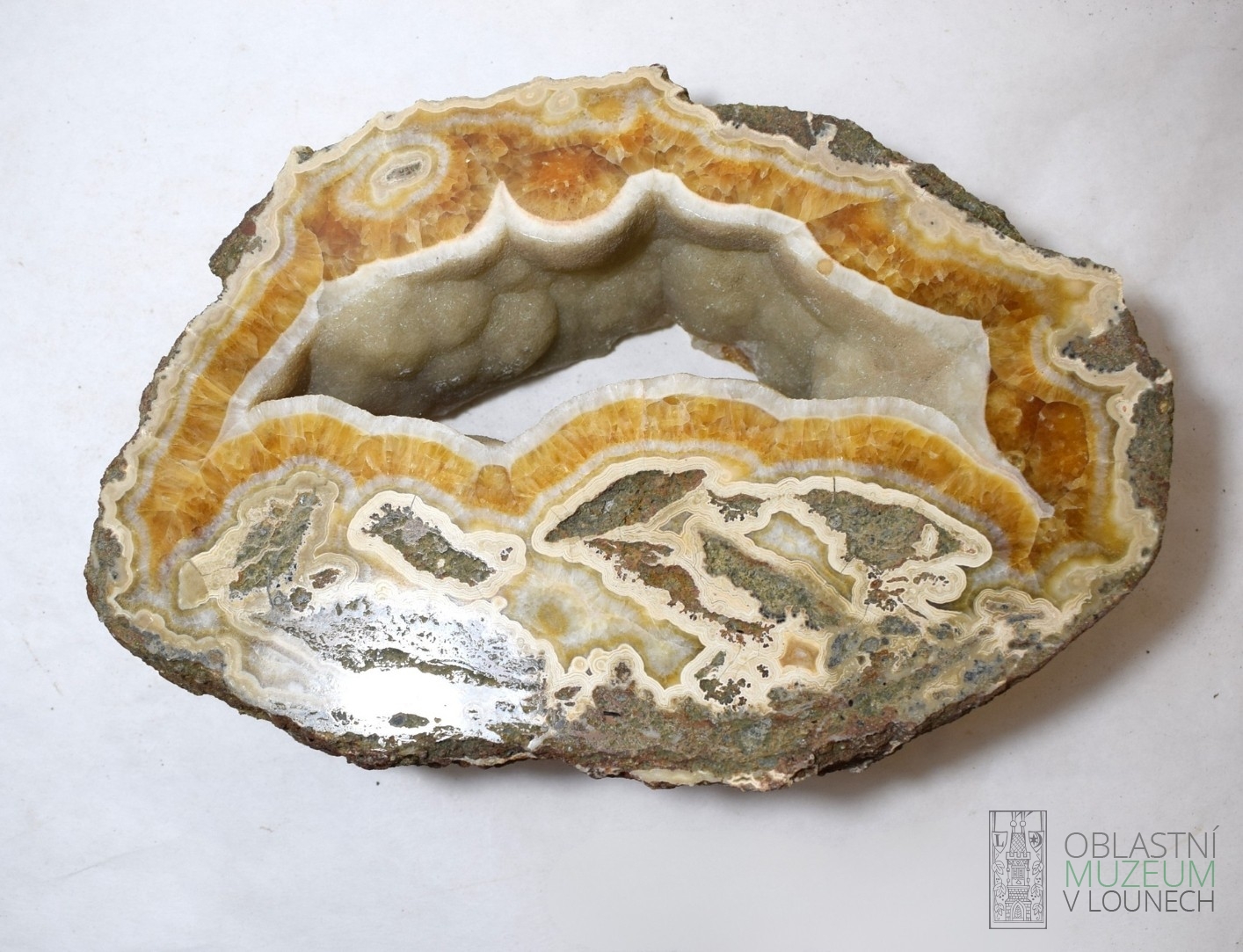 Leštěná polodeska kalcitového achátu oranžově-béžové barvy. Výplň dutiny po zuhelnatělém kmenu stromu.