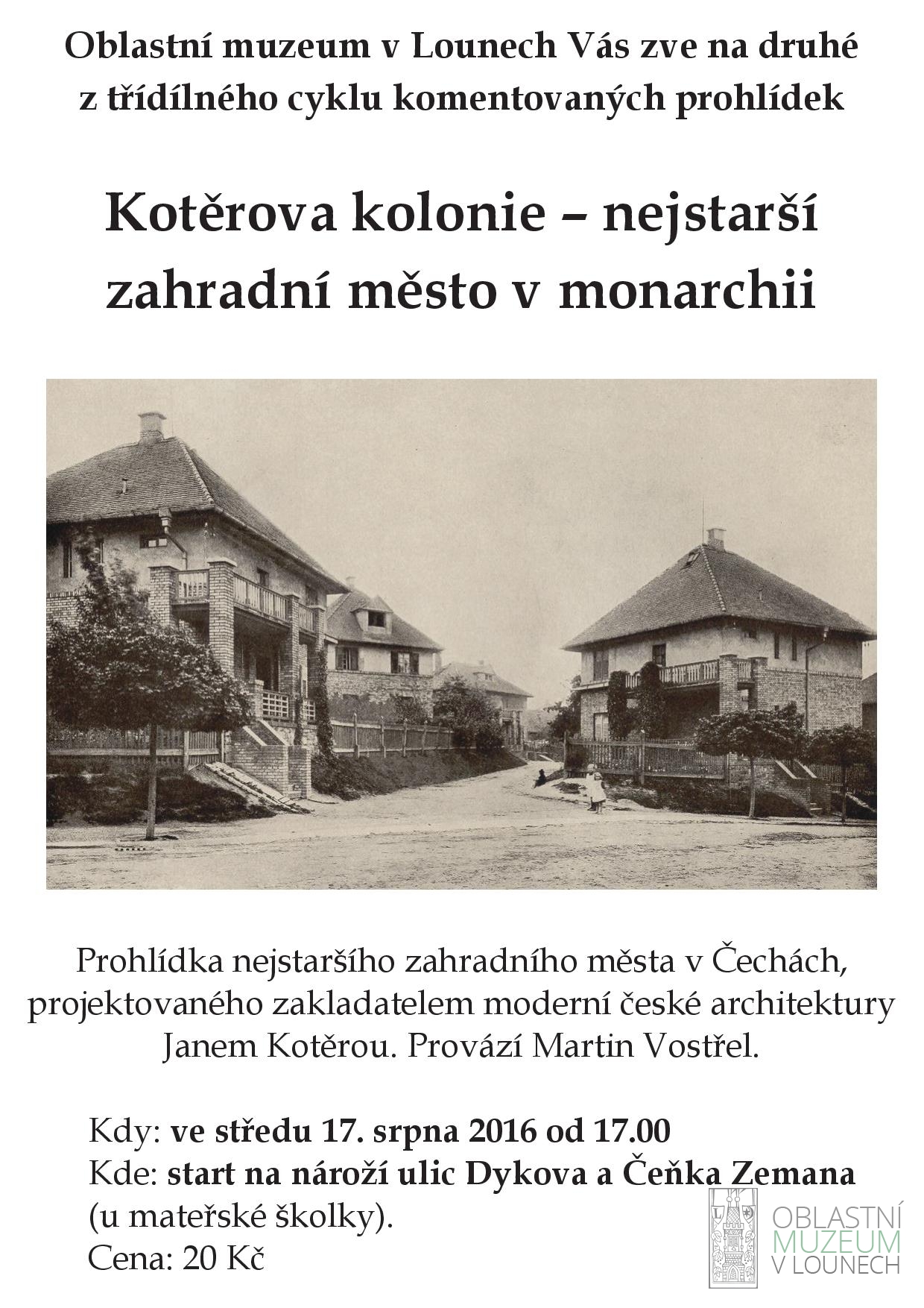Prohlídka nejstaršího zahradního města v Čechách, projektovaného zakladatelem moderní české architektury Janem Kotěrou. Start ve středu 17. srpna v 17.00 na nároží ulic Dykova a Čeňka Zemana (u mateřské školky). Cena komentované prohlídky 20 Kč. Provází M. Vostřel.