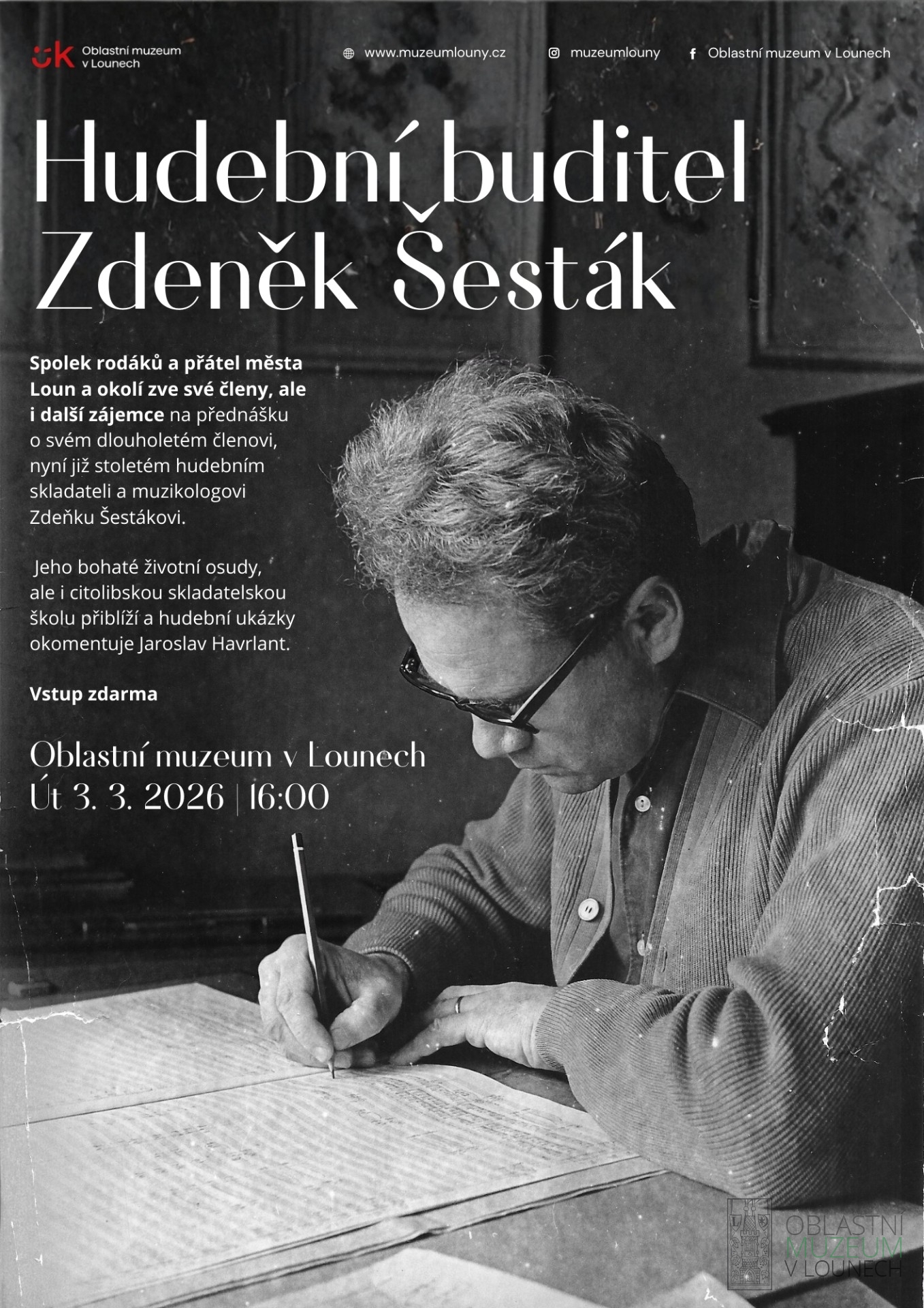 Spolek rodáků a přátel města Loun a okolí zve své členy, ale i další zájemce na přednášku o svém dlouholetém členovi, nyní již stoletém hudebním skladateli a muzikologovi Zdeňku Šestákovi.