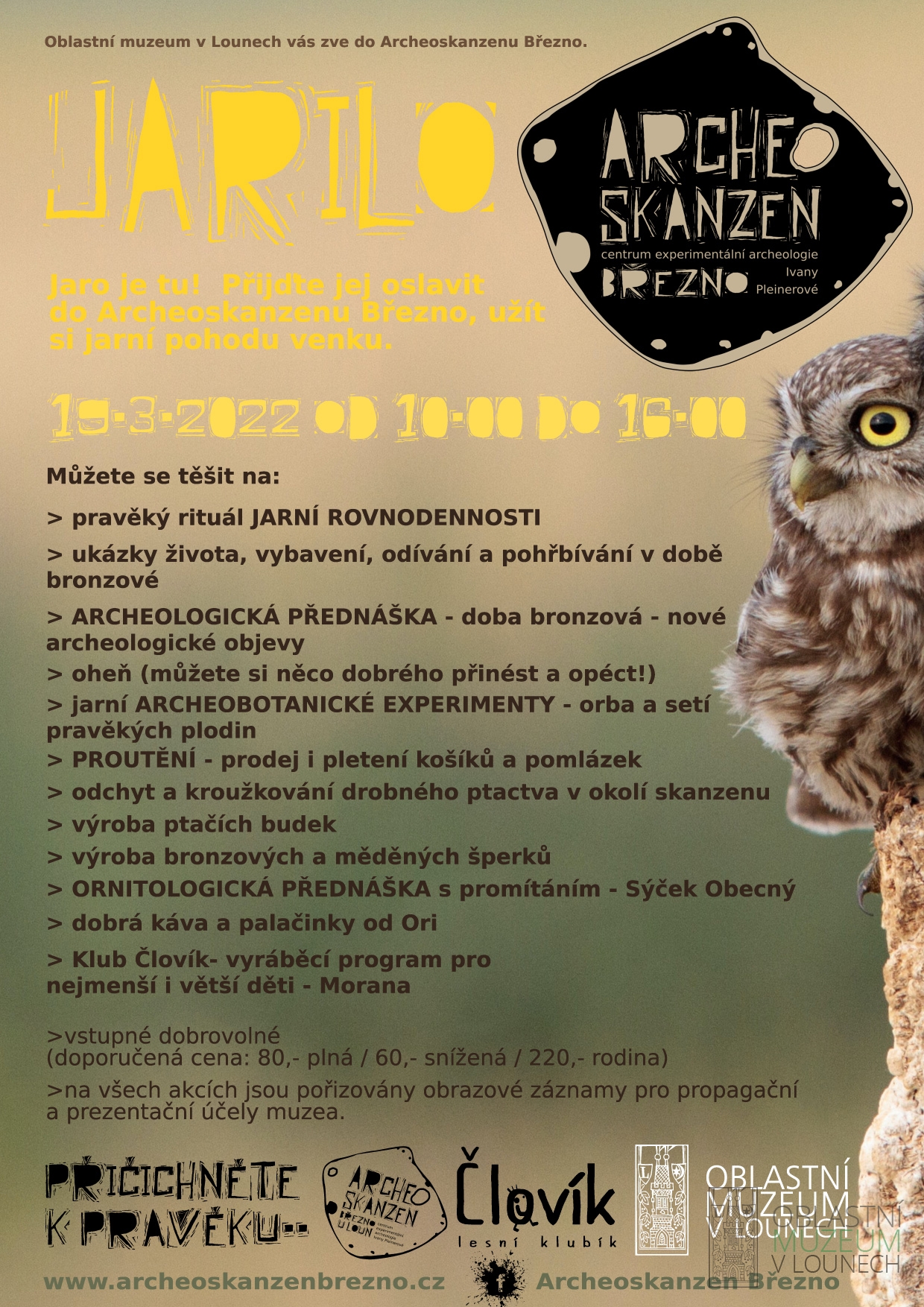 Přivítejte s námi jaro v Archeoskanzenu Březno! Návštěvníky čeká bohatý program archeologický (přednáška, ukázky života a vybavení v době bonzové, experimentální archeologie, staré výrobní postupy), rukodělný (pletení nejen pomlázek, výroba bronzových a měděných šperků, výroba ptačích budek) i ornitologický (kroužkování ptáků, povídání o sýčkovi s promítáním), k tomu další program pro děti (lesní klub Človík), dále pravěký rituál jarní rovnodennosti a mnohé další. Kompletní přehled programu v přiložené pozvánce. Těšíme se na vaši návštěvu!