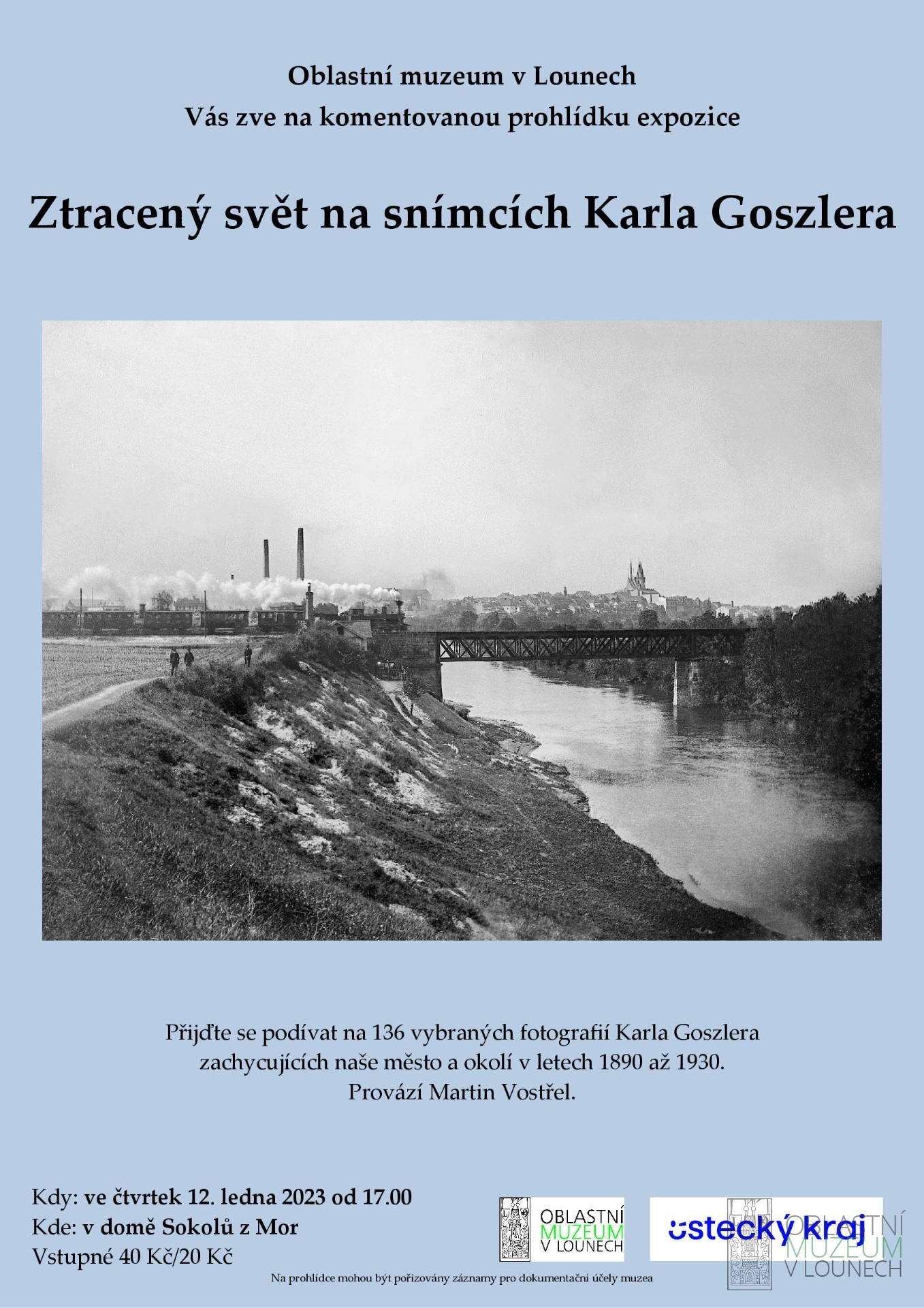 Dovolujeme si Vás pozvat na komentovanou prohlídku expozice Ztracený svět na snímcích Karla Goszlera – Lounsko a turistika před 100 lety, která se uskuteční ve čtvrtek 12. ledna od 17.00 v lounském muzeu v domě Sokolů z Mor. Přijďte se podívat na 136 vybraných fotografií velkého turisty a vynikajícího fotografova Karla Goszlera. Provázet Vás bude kurátor Martin Vostřel.