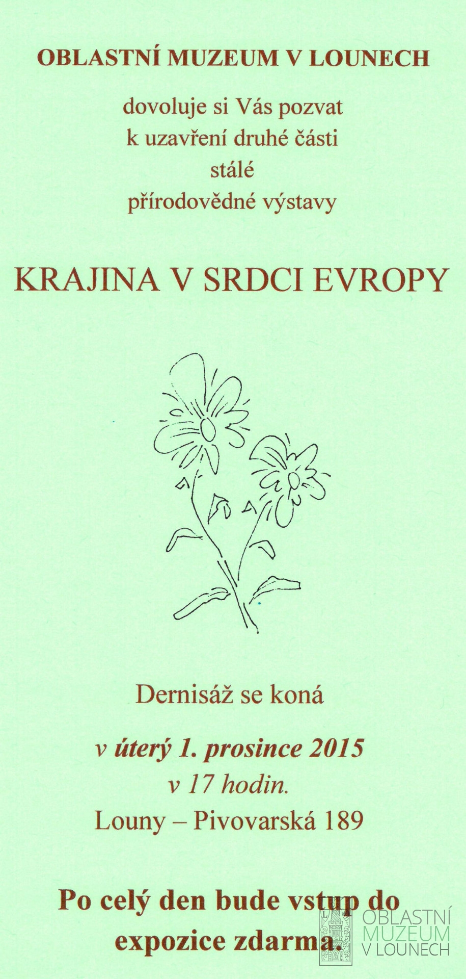 Vás Oblastní muzeum v Lounech zve na dernisáž části přírodovědné expozice KRAJINA V SRDCI EVROPY, kde promluví i její autor Mgr. Antonín Hluštík. Uzavřena bude druhá část expozice, která je věnovaná především chráněným lokalitám, stavu životního prostředí a přírodním zajímavostem na Lounsku a Žatecku. Na tomto místě pro Vás připravíme ve spolupráci se Správou CHKO České středohoří novou expozici na téma Stepi lounského středohoří. V rámci dernisáže bude představen projekt a nová podoba této místnosti. Jste srdečně zváni.