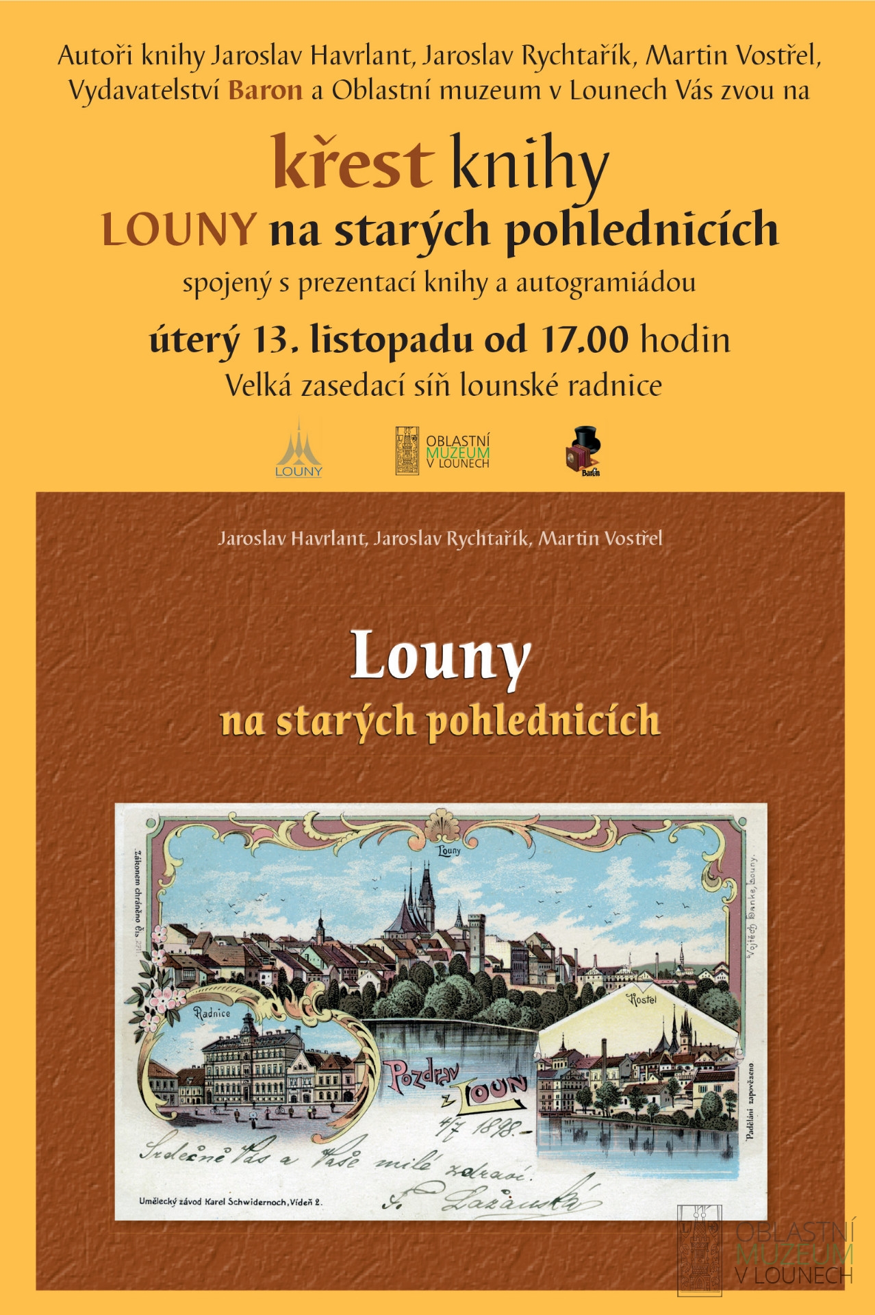 V úterý 13. listopadu v 17 hodin představí knihu v zasedací síni lounské radnice Jaroslav Havrlant, Jaroslav Rychtařík a Martin Vostřel.