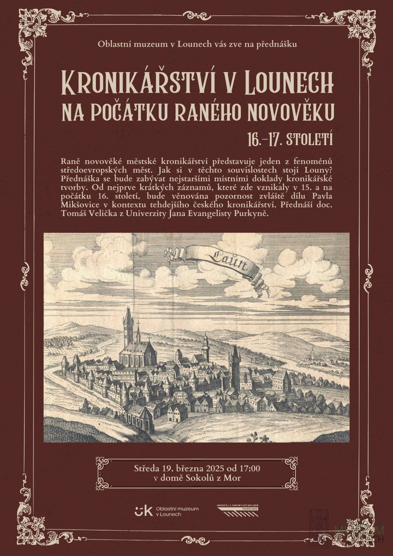 Raně novověké městské kronikářství představuje jeden z fenoménů středoevropských měst. Jak si v těchto souvislostech stojí Louny? Přednáška se bude zabývat nejstaršími místními doklady kronikářské tvorby. Od nejprve krátkých záznamů, které zde vznikaly v 15. a na počátku 16. století, bude věnována pozornost zvláště dílu Pavla Mikšovice v kontextu tehdejšího českého kronikářství. Přednáší doc. Tomáš Velička z Univerzity J. E. Purkyněho v Ústí nad Labem.