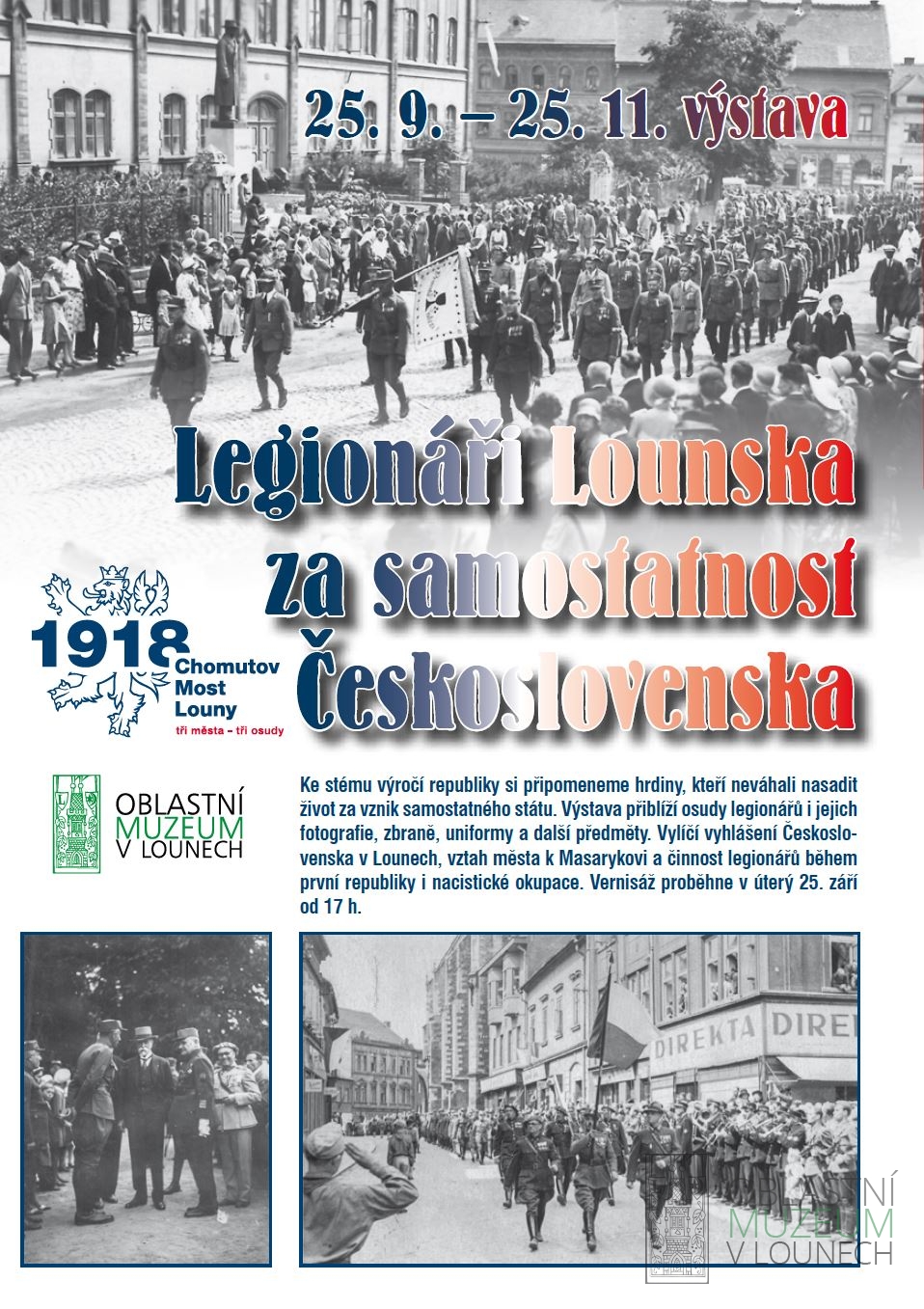Výstavou věnovanou legionářům připomene Oblastní muzeum v Lounech 100 let od vzniku Československa. Rok 1918 znamenal pro většinu legionářů nejen konec války, ale i počátek republiky, za kterou nasazovali svůj život. Jen díky jejich bojové aktivitě a diplomatické činnosti zahraniční Československé národní rady v čele s T. G. Masarykem mohl samostatný stát vzniknout.