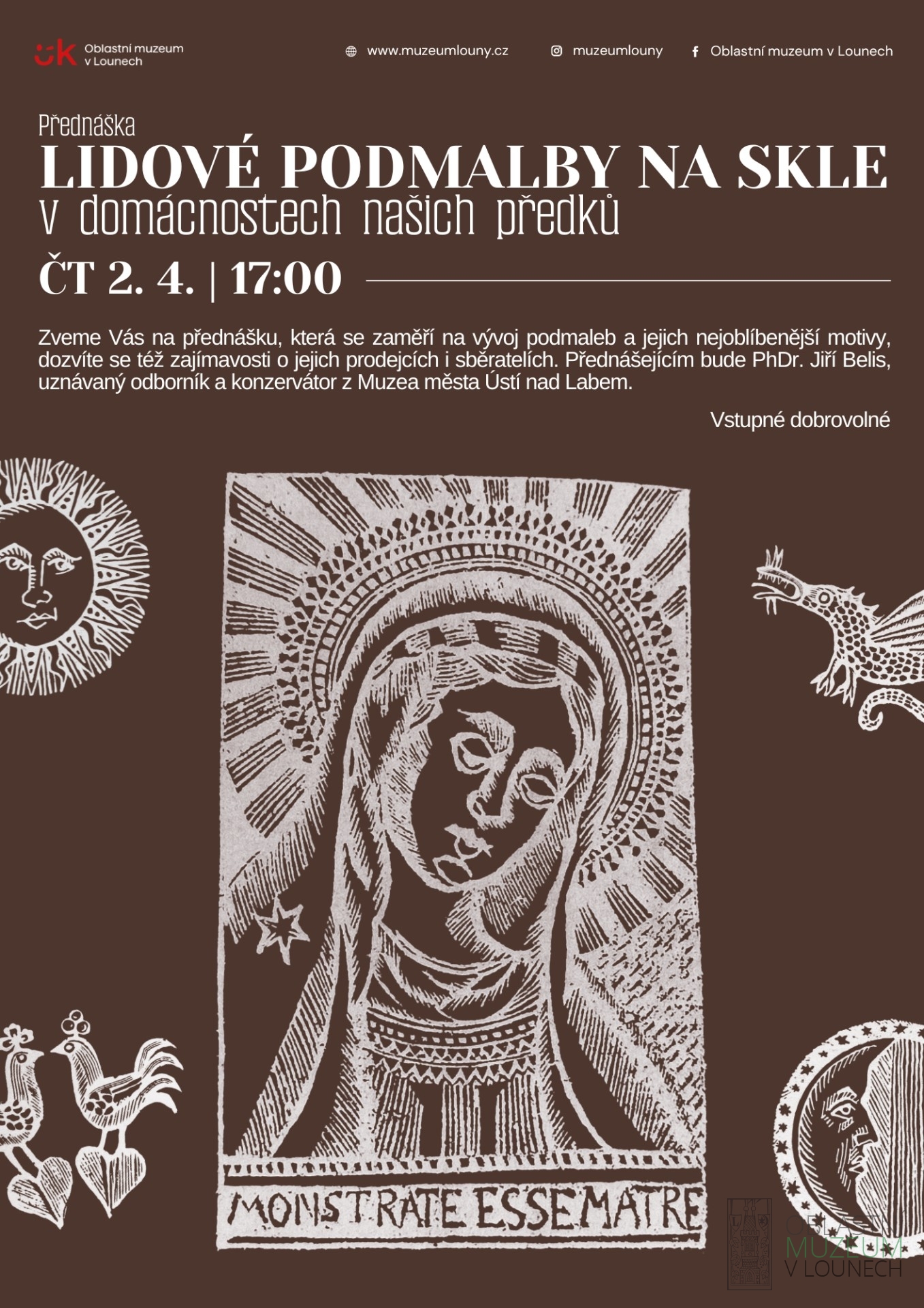 Zveme Vás na přednášku, která se zaměří na vývoj podmaleb a jejich nejoblíbenější motivy, dozvíte se též zajímavosti o jejich prodejcích i sběratelích.