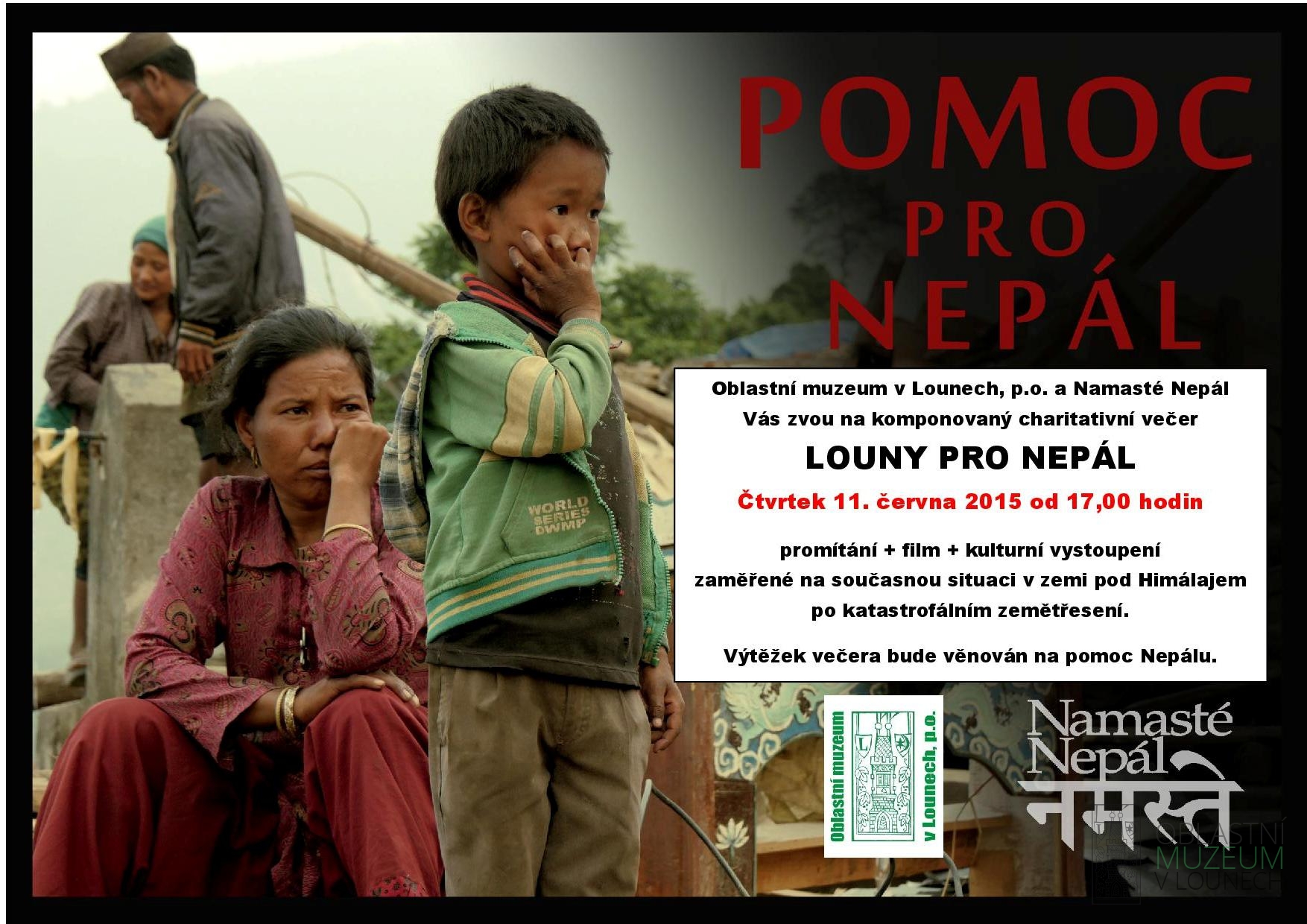 Oblastní muzeum v Lounech, p.o. a Namasté Nepál, z.s. Vás zvou ve čtvrtek 11. června 2015 od 17.00 hodin do Oblastního muzea v Lounech na komponovaný charitativní večer, který bude zaměřený na současnou situaci v Nepálu, postiženém katastrofálním zemětřesením. Výtěžek večera bude věnován na pomoc lidem, kteří přišli o své domovy.