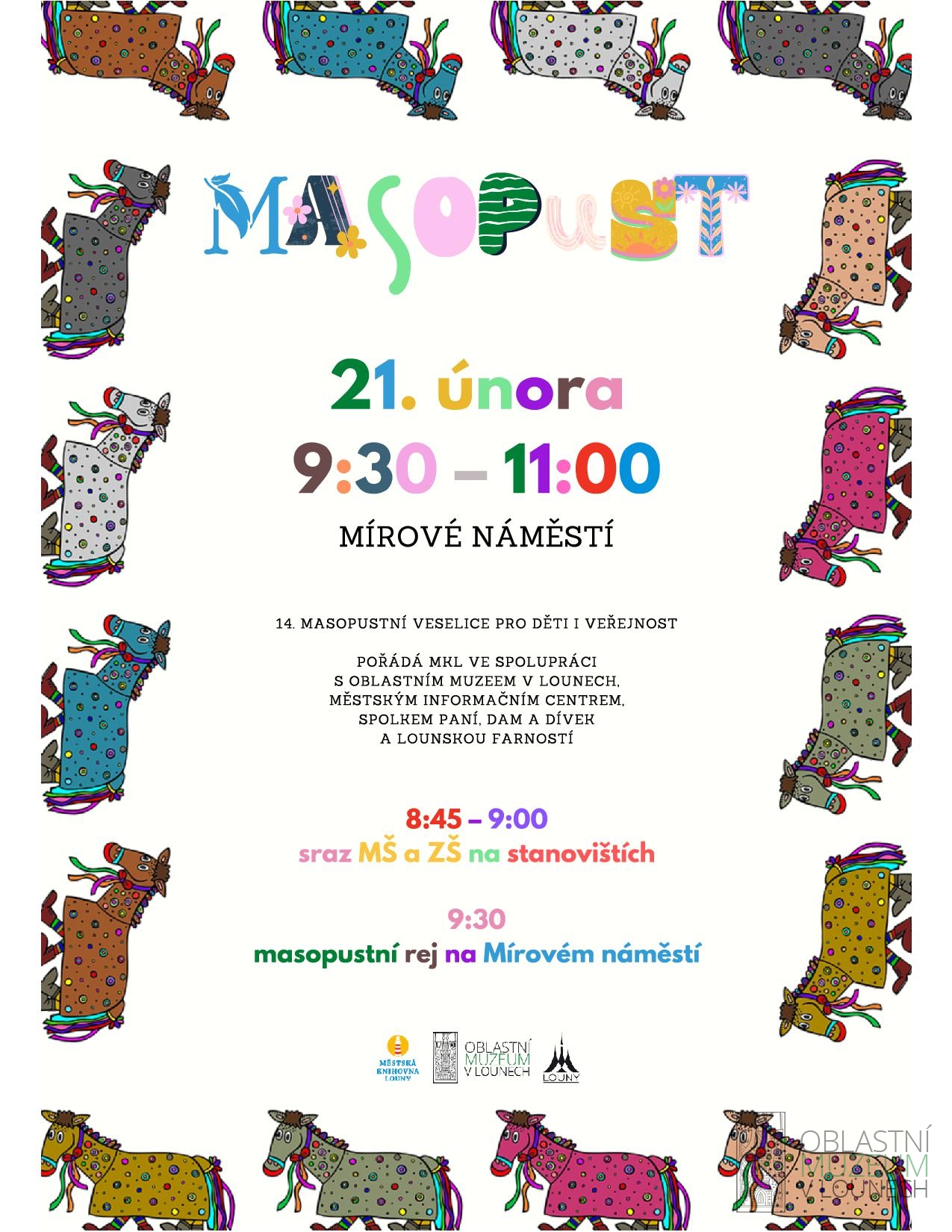 Muzeum doprovází jeden ze tří masopustních průvodů - děti ze západní části Loun. Sejdeme se v 8:45 před Žateckou bránou a půjdeme kolem muzea a kostela společně na náměstí, kde v 9:30 začíná společný program.