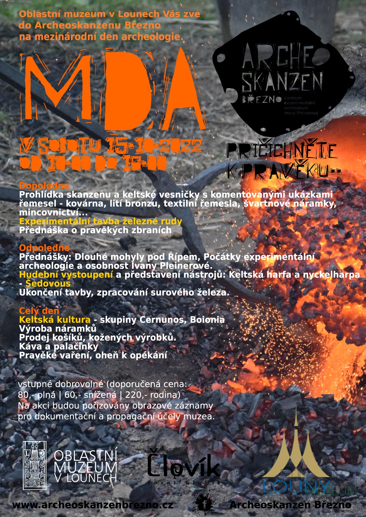 Z programu: experimentální tavba železné rudy a zpracování surového železa, ukázka keltské vesničky s komentovanými ukázkami řemesel (kovárna, lití bronzu, textilní řemesla…), přednášky Pravěké zbraně, Dlouhé mohyly pod Řípem, Počátky experimentální archeologie a osobnost Ivany Pleinerové, hudební vystoupení Šedovous – keltská harfa. Podrobný program v pozvánce.