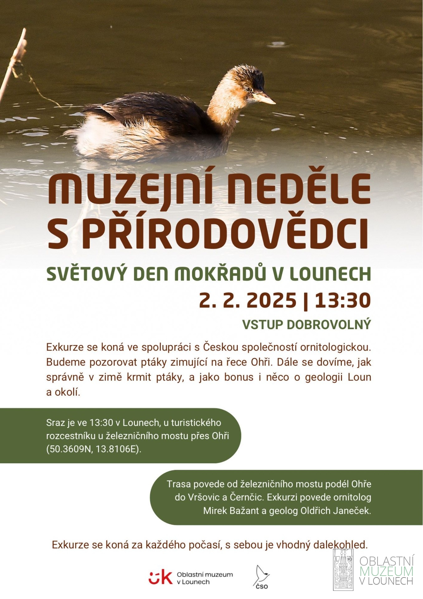 Exkurze se koná ve spolupráci s Českou společností ornitologickou. Během exkurze budeme pozorovat ptáky zimující na řece Ohři (k dispozici bude stativový dalekohled). Dále se dozvíme, jak správně v zimě krmit ptáky, a jako bonus i něco o geologii Loun a okolí. Sraz je ve 13:30 v Lounech, u turistického rozcestníku u železničního mostu přes Ohři (50.3609N, 13.8106E). Trasa povede od železničního mostu podél Ohře do Vršovic a Černčic. Exkurzi povede ornitolog Mirek Bažant a geolog Oldřich Janeček. Vstup volný. Exkurze se koná za každého počasí, s sebou je vhodný dalekohled. Z Černčic je možno se vrátit se do Loun autobusem (16:14, 16:24, 17:01).