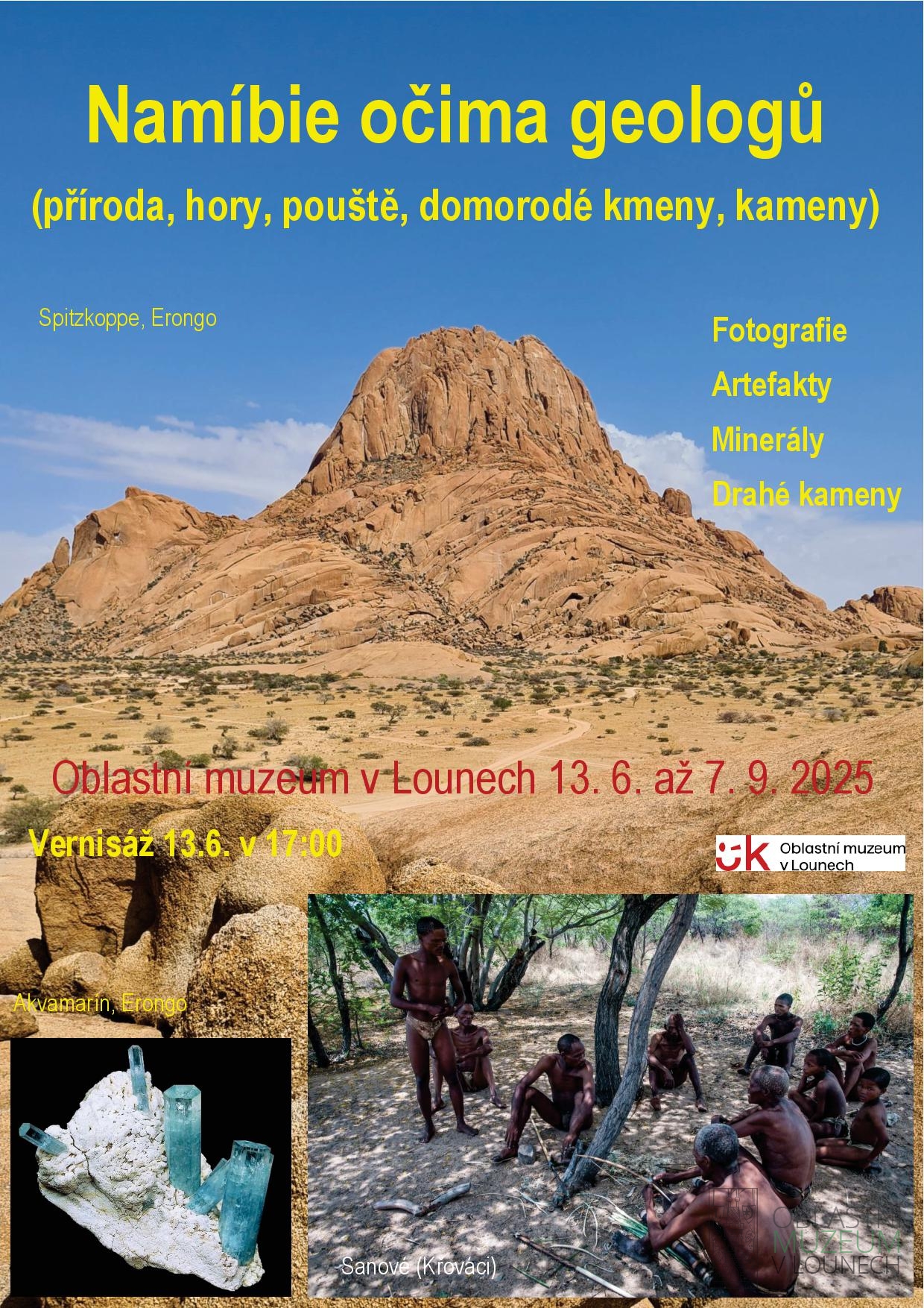 Namíbie je krásná země na jihu Afriky s úžasnou přírodou, horami, pouštěmi, velkým nerostným bohatstvím, obývaná domorodými kmeny odlišného vzhledu a zvyků. Přijďte se podívat na fotografie, artefakty a minerály, které pořídili a přivezli čeští geologové, pro které se tato málo obydlená země stala bezpečným cestovatelským rájem. Vernisáž výstavy se koná 13. 6. v 17:00 v rámci Muzejní noci.
