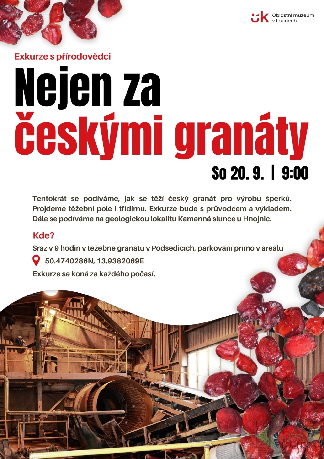 Tentokrát se podíváme, jak se těží český granát pro výrobu šperků. Projdeme těžební pole i třídírnu. Exkurze bude s průvodcem a výkladem. Dále se podíváme na geologickou lokalitu Kamenná slunce u Hnojnic. Sraz v 9 hodin v těžebně granátu v Podsedicích, parkování přímo v areálu 50.4740286N, 13.9382069E. Exkurze se koná za každého počasí.
