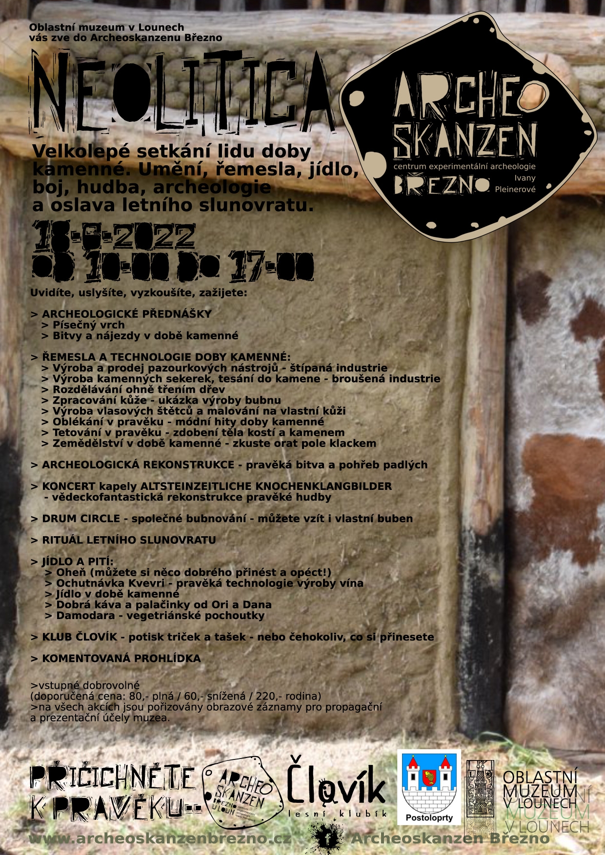 Velkolepé setkání lidu doby kamenné v Archeoskanzenu Březno již 18. 6. 2022 od 10 do 17 hod.. Čekají Vás archeologické přednášky – Písečný vrch, Bitvy a nájezdy doby kamenné, řemesla a technologie doby kamenné – výroba štípaných nástrojů z pazourku, broušených kamenných sekerek, zpracování kůže, oblékání a tetování v pravěku, archeologická rekonstrukce pravěké bitvy a pohřbu padlých, koncert pravěké kapely Altsteinzeitliche Knochenklangbilder, rituál letního slunovratu, jídlo v době kamenné, ochutnávka vína Kvevri vyráběného pravěkou technologií, dobré občerstvení a mnohé další. Dobrovolné vstupné (doporučené 80/60 Kč, 220 Kč rodinné).