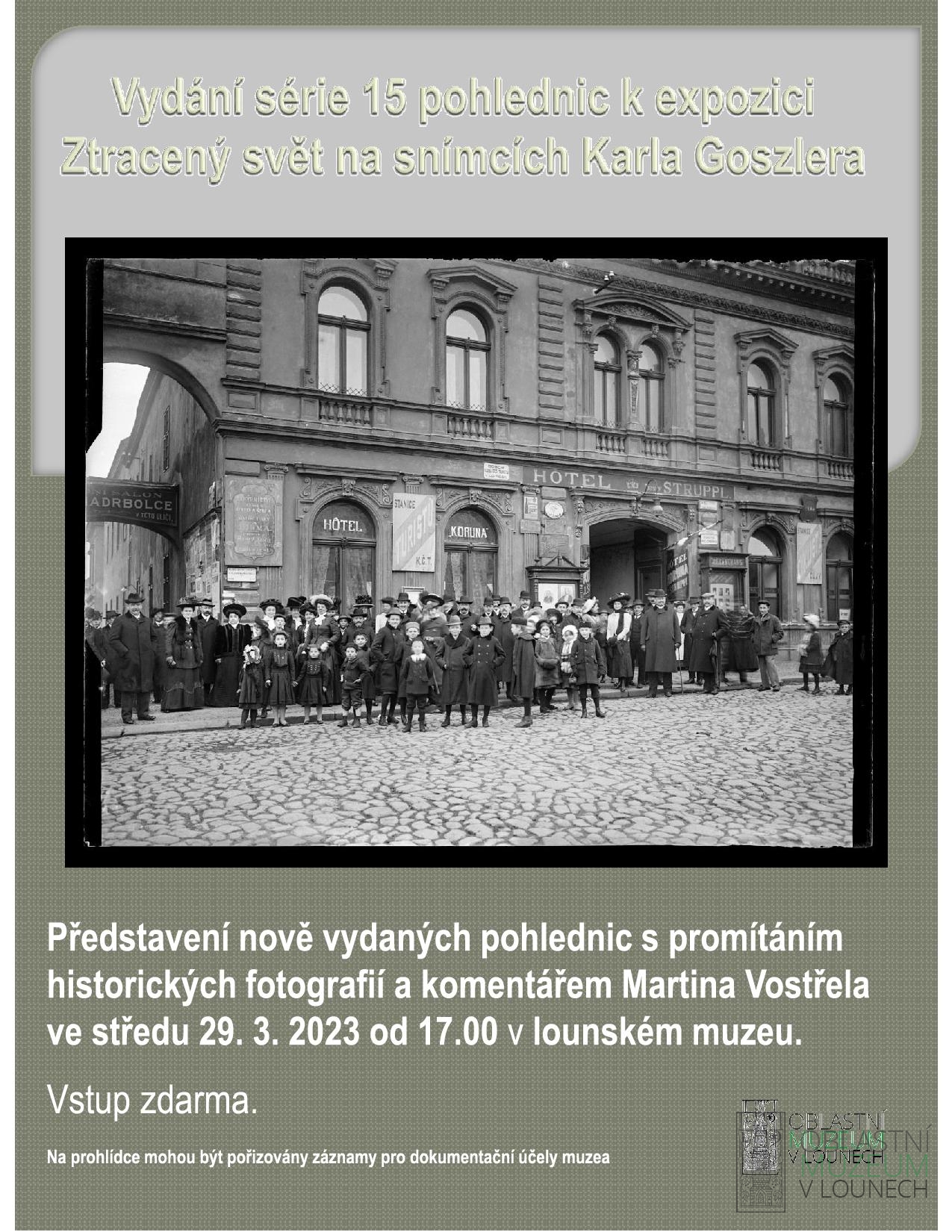 Ve středu 29. března 2023 od 17.00 se v lounském muzeu uskuteční uvedení sady 15 pohlednic fotografa Karla Goszlera, které si budete moci zakoupit v lounském muzeu. Budou se promítat fotografie Karla Goszlera.