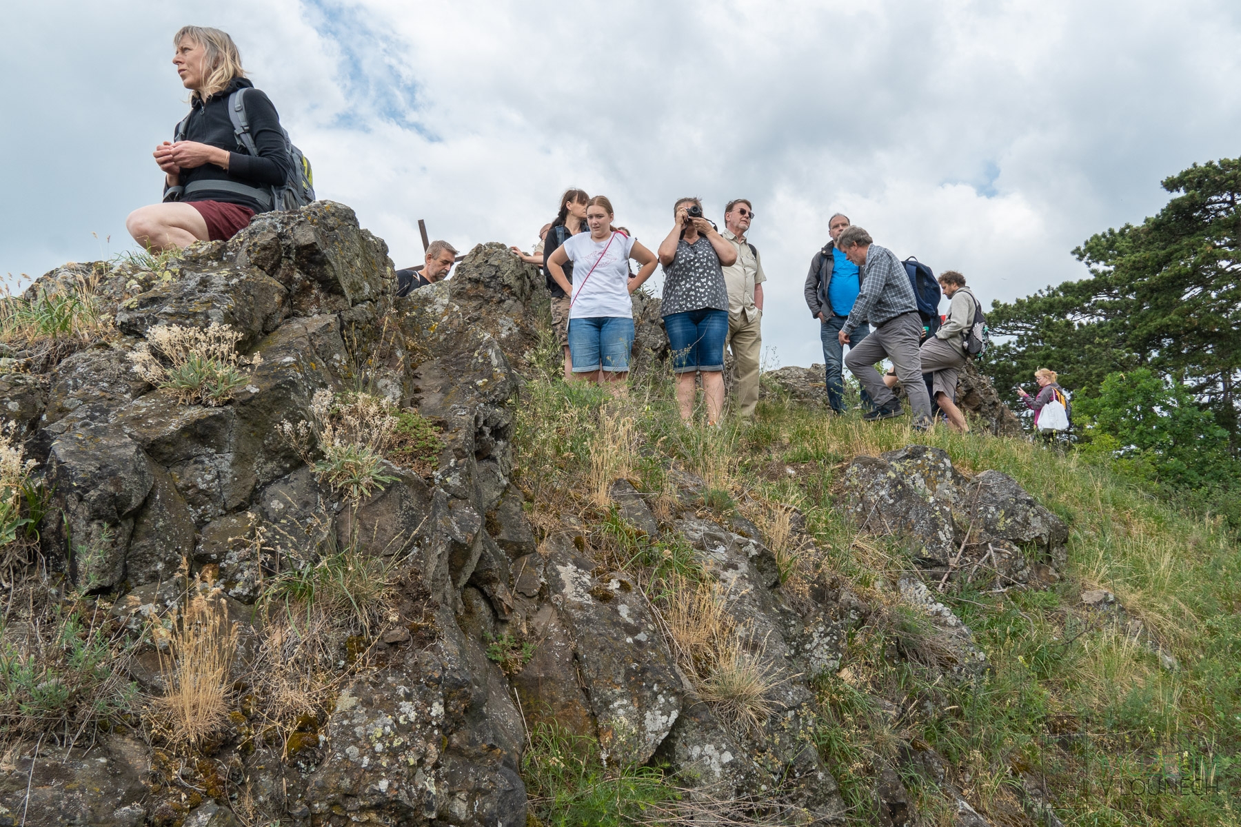 2. Jak dokáží rostliny přežít extrémní podmínky skal? To se dozvěděli účastníci exkurze v botanické části výkladu. V popředí na skále už odkvetlá tařice skalní.