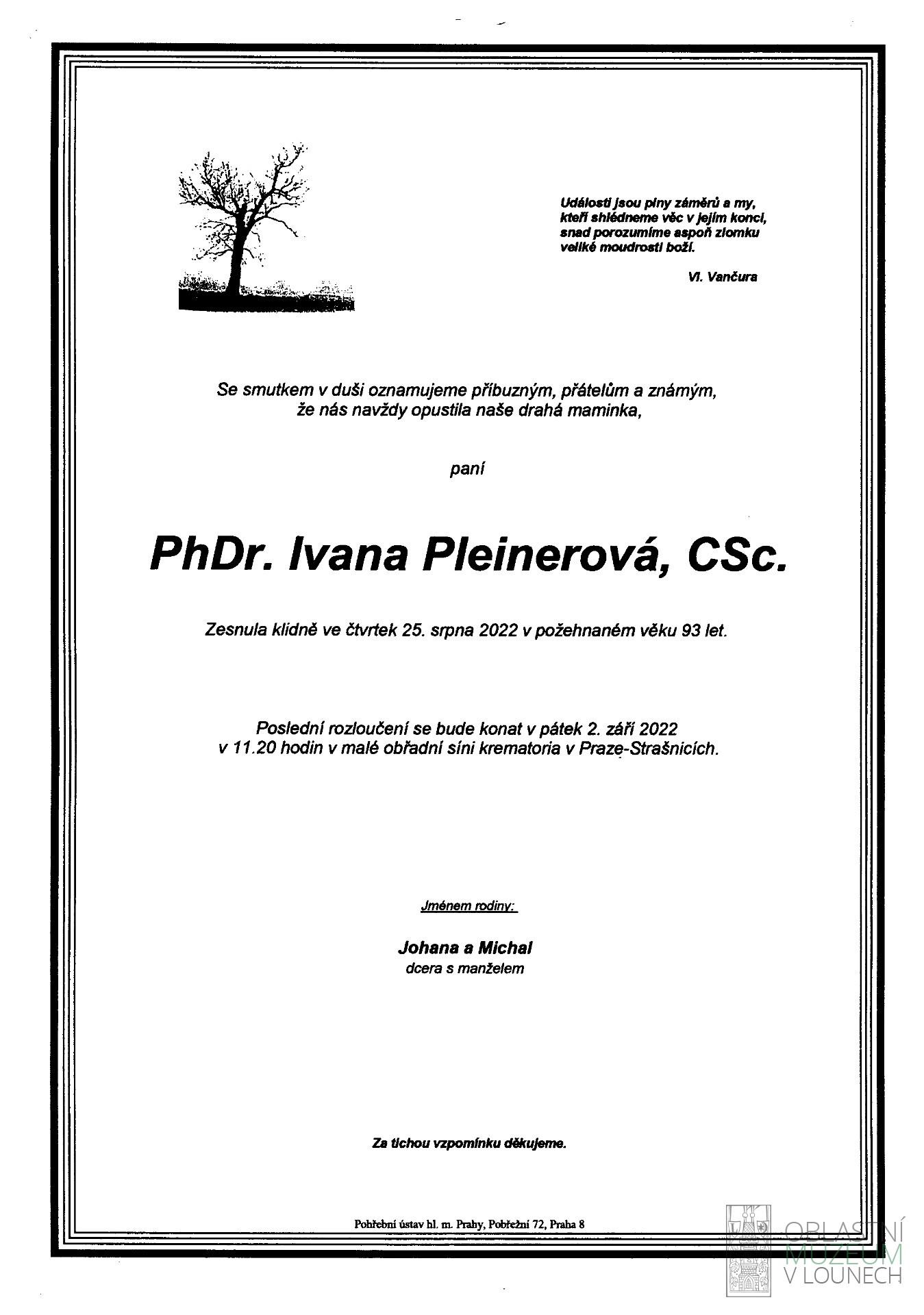 Jsou lidé, jejichž životní pouť lze popsat jednostránkovým textem a na druhé straně potkáváme osobnosti, jejichž život a práce by vydaly na knížku. Do té druhé skupiny bezesporu patří PhDr. Ivana Pleinerová, CSc., která zemřela v Praze 25. srpna. Její odborné začátky působení v severozápadních Čechách jsou svázané, tak jako u většiny absolventů studia archeologie v té době s nově ustavenou mosteckou expoziturou Archeologického ústavu ČSAV. Osudným se jí stal objev dvou hrobů ze starší doby bronzové v povodní strženém břehu Ohře u Března. Jako specialistka na starší dobu bronzovou uvítala příležitost prozkoumat do té doby málo známé pravěké osídlení Lounska. Původně malý výzkum pohřebiště únětické kultury starší doby bronzové zcela změnil objev osady prvních Slovanů na našem území z druhé poloviny 6. stol. Následoval velkoplošný výzkum, který odhalil sídliště v mladší doby kamenné, starší, střední i mladší doby bronzové, hroby ze starší i mladší doby železné a právě z odborného hlediska nesmírně důležité osady z doby stěhování národů a počátků slovanského osídlení našich zemí. Po ukončení výzkumu zpracovala dr. Pleinerová výsledky do řady odborných publikací a článků v různých tuzemských i zahraničních periodikách. Bez odborného vyhodnocení a publikace by v depozitářích lounského muzea ležely pouze bedny zaplněné množstvím nálezů s průvodní dokumentací. Završením březenského výzkumu se stalo experimentální pracoviště, které na půdorysech konkrétních objektů, objevených během výzkumu, rekonstruovalo ve spolupráci s architekty původní podobu staveb za použití replik originálních dobových nástrojů. V současnosti jsou pro širokou veřejnost v březenském skanzenu zachované věrné repliky z různých období pravěku a časné doby dějinné. Výzkum v Březně u Loun nastolil celou řadu otázek o vztazích, které bylo nutné řešit na podstatně větším území. Následovaly proto systematické průzkumy téměř celého Lounska ve spolupráci s pracovníky lounského muzea a kolegy z expozitury. Výsledkem bylo pojednání o starší době bronzové v severozápadních Čechách a studie o skupinových pohřebištích únětické kultury starší doby bronzové. Své ovoce přinášela i úzká spolupráce s obsluhou zemních strojů. Na základě oznámení řidičů bagrů a buldozerů probíhalo na celém Lounsku množství drobných záchranných archeologických výzkumů. Za ty nejvýznamnější lze uvést rozsáhlé pohřebiště z mladší doby římské v Opočně, osadu ze starší doby železné v pískovně u Skupic nebo průběžné sledování těžby písku v Blšanech u Loun. Jsou to výsledky mnohaletého odborného působení, kterým dr. Pleinerová výrazně poodhalila vývoj pravěkého osídlení Lounska. Nezbývá než se sklonit a vzdát úctu člověku, který položil základy pro odbornou práci mladších kolegů a důležitý opěrný bod v prehistorii regionálních dějin.