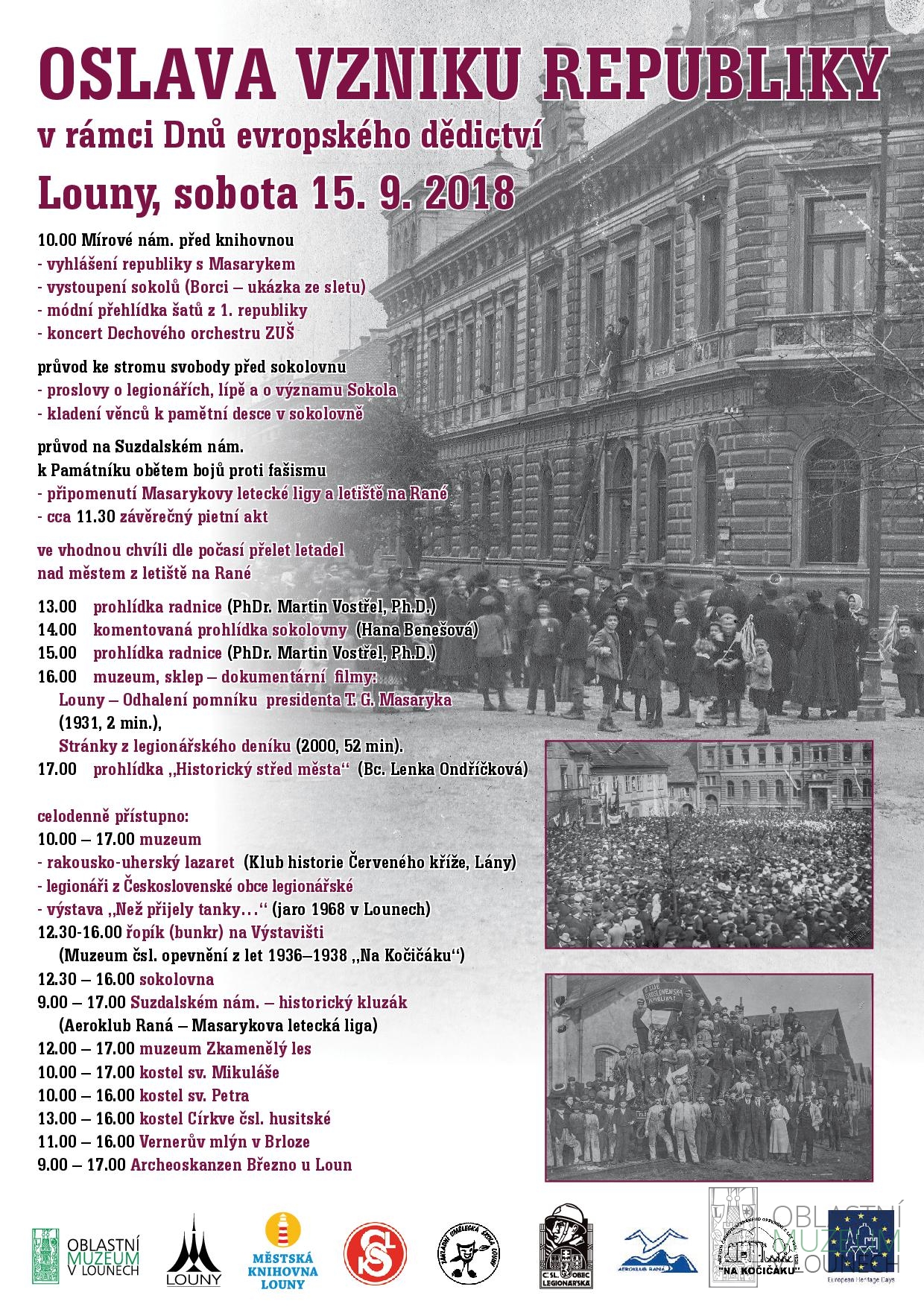 V rámci Dnů evropského dědictví v sobotu 15. 9. 2018 od 10 h. lounské muzeum s dalšími organizacemi připravuje velkolepou akci, na kterou přijedou rakousko-uherští zdravotníci, legionáři, prvorepublikoví vojáci i prezident Masaryk. Na hodinový program na náměstí bude navazovat průvod před sokolovnu k lípě svobody a na Suzdalské náměstí k Památníku obětem bojů proti fašismu, kde proběhnou pietní akty. Odpoledne bude přístupná mimo jiné radnice, sokolovna, bude možné si prohlédnout historický kluzák nebo na Výstavišti obnovovaný řopík. V muzeu bude polní lazaret i legionáři.