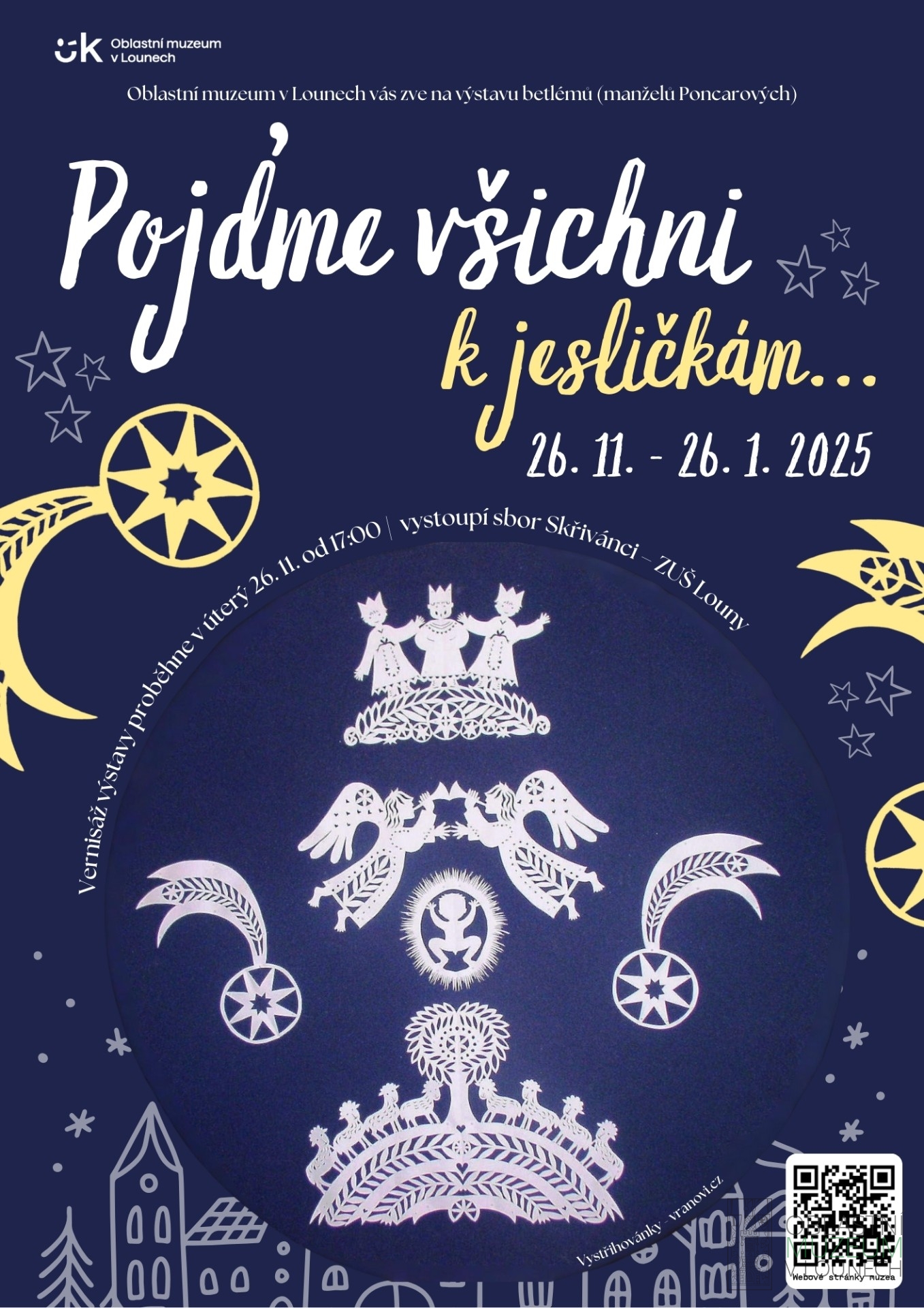 Po devíti letech se do našeho muzea vrací jesličky rodiny Poncarovy, část jedné z největších sbírek betlémů v Lounech. Představí se vám exponáty z nejrůznějších materiálů, z papíru, skla, moduritu, keramiky, ale také z různých přírodnin. Vernisáž proběhne v úterý 26. 11. od 17 hodin a vystoupí na ní žáci ZUŠ Louny.