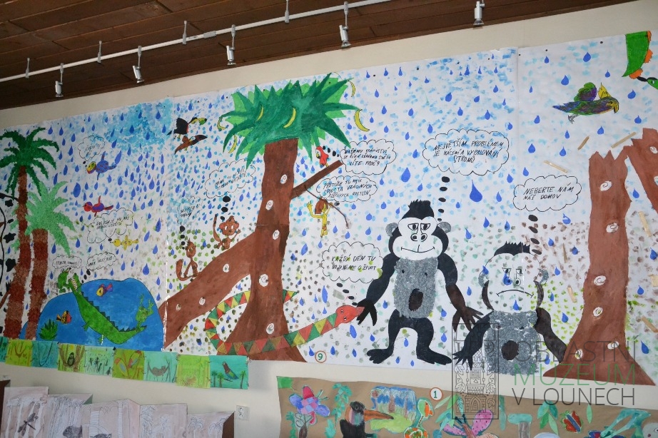 Výstava výtvarných prací ze soutěže Pralesy, vyhlášené Ekocentrem Dymnivka při DDM Postoloprty na téma ochrany tropických deštných lesů.