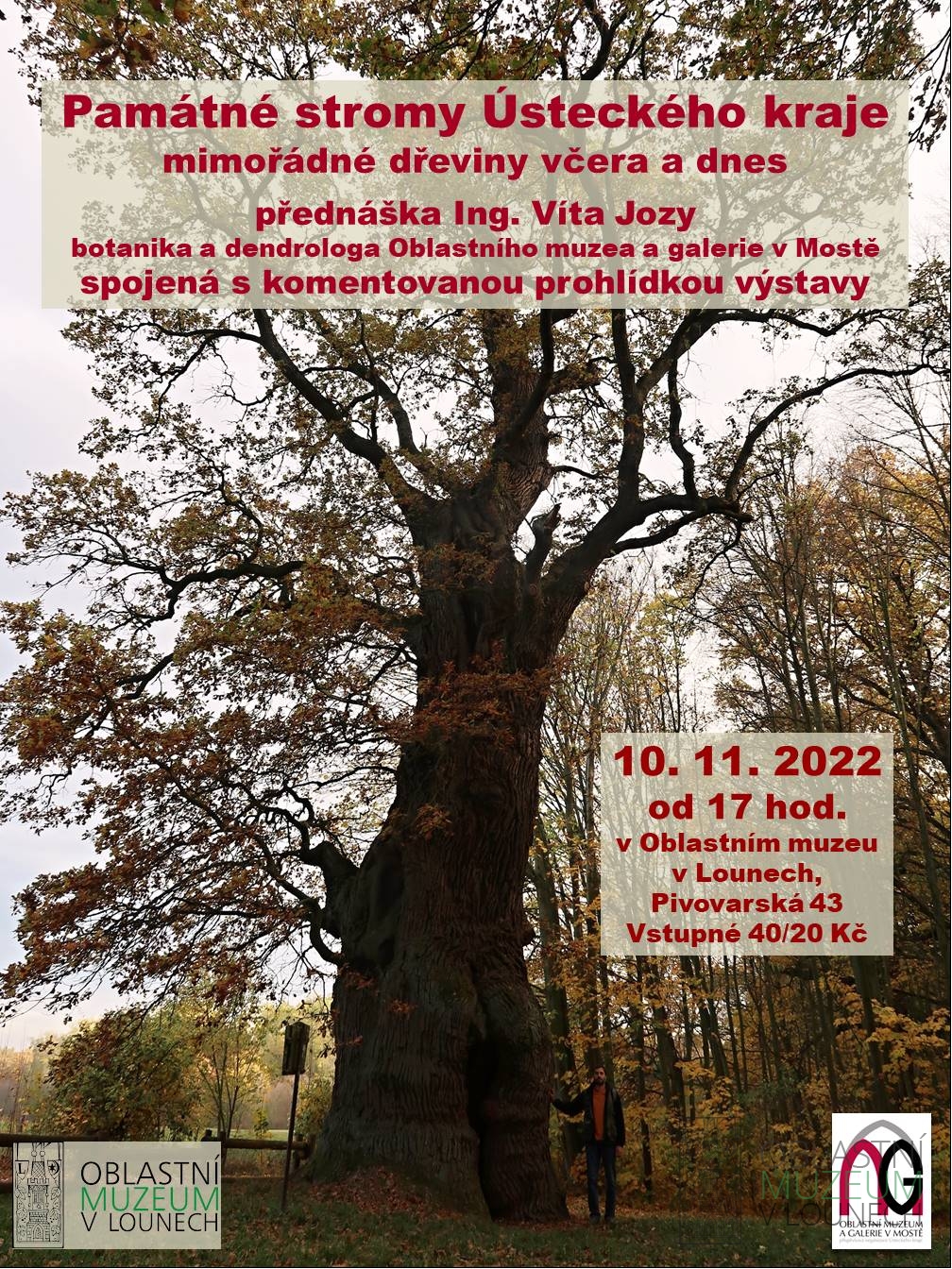 Ve čtvrtek 10. 11. od 17.00 Vás čeká přednáška a komentovaná prohlídka s autorem stejnojmenné výstavy Ing. Vítem Jozou, botanikem a dendrologem Oblastního muzea a galerie v Mostě. Zároveň máte do 13. 11. 2022 poslední možnost shlédnout tuto výstavu o památných stromech v Ústeckém kraji.