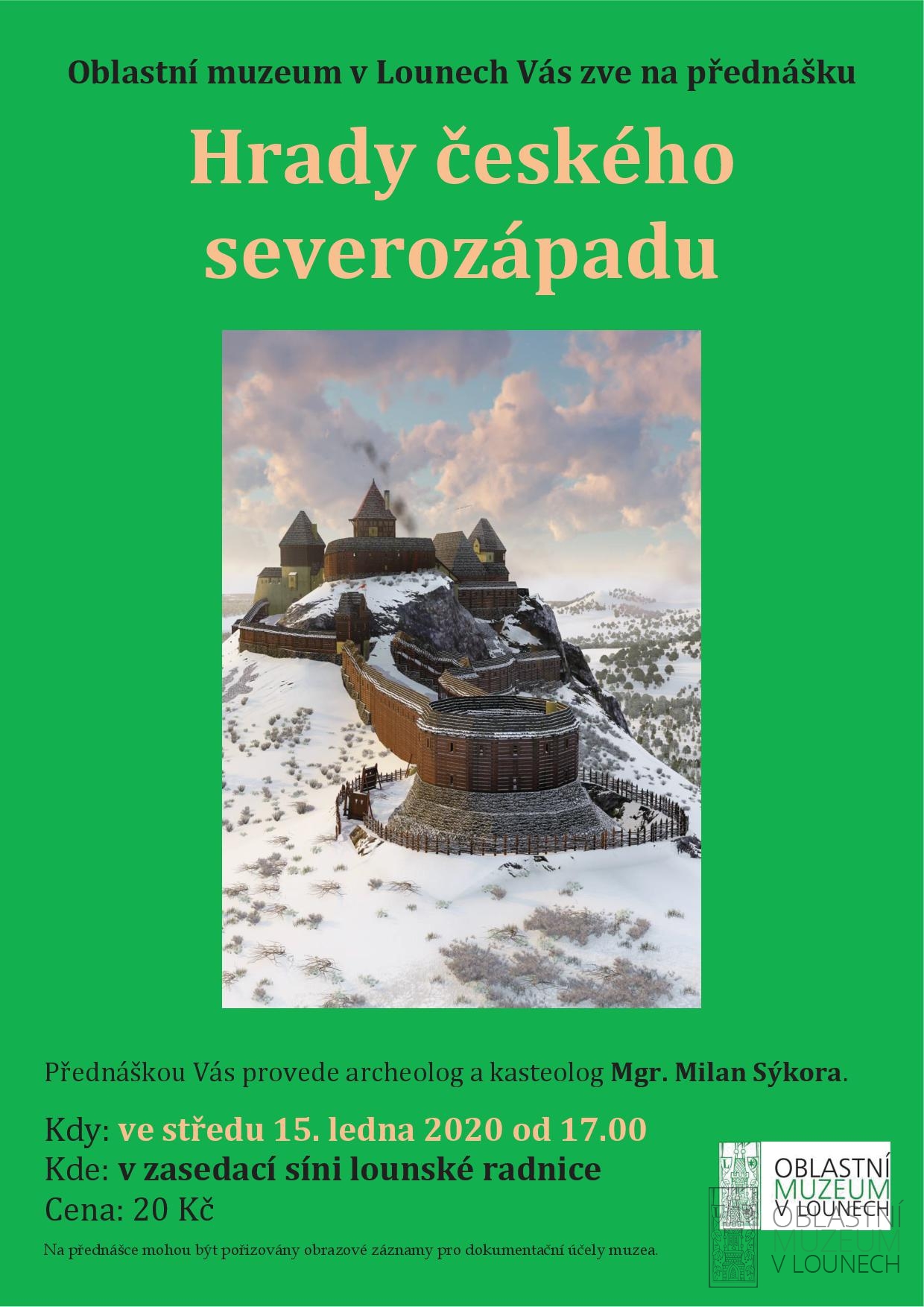 Dovolujeme si Vás pozvat na první letošní muzejní přednášku Hrady českého severozápadu. Přednášejícím bude archeolog a kasteolog Mgr. Milan Sýkora z Ústavu archeologické památkové péče severozápadních Čech. Těšíme se na Vás netradičně ve středu 15. ledna od 17.00 v zasedací síni lounské radnice. Vstupné 20 Kč.