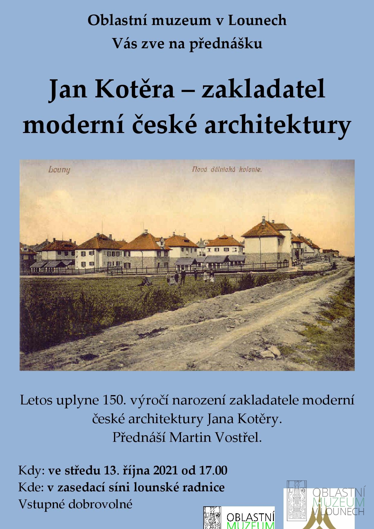 Ve středu 13. října se od 17.00 uskuteční přednáška u příležitosti 150. výročí narození významného českého architekta. Seznámíte se detailně s životem a tvorbou Jana Kotěry a dozvíte se mimo jiné, v jakých souvislostech vznikala dělnická kolonie v Lounech, která vychází z anglického hnutí zahradních měst. Přednáška se koná ve velké zasedací síni lounské radnice. Přednáší PhDr. Martin Vostřel, Ph.D. Vstupné dobrovolné.