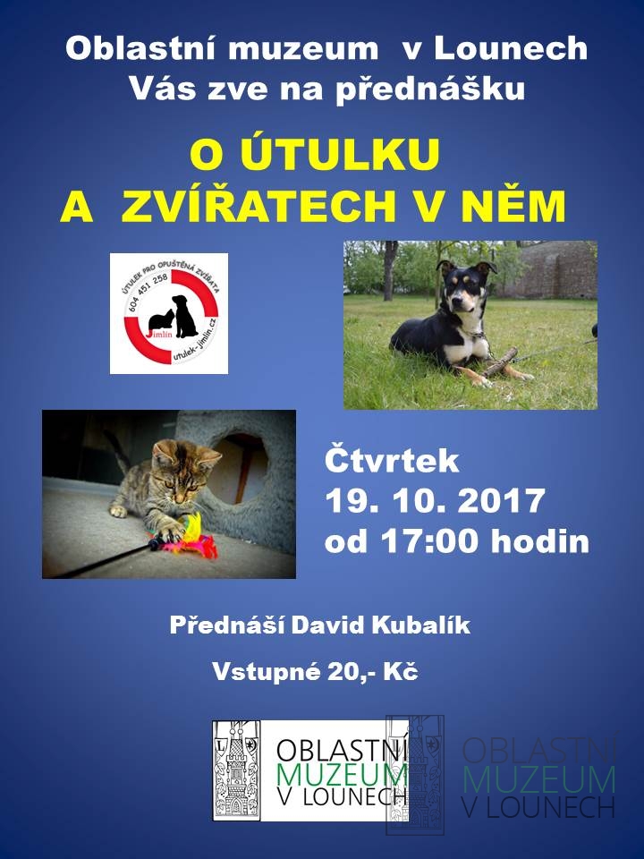 Nejenom o psech, ale i o dalších zvířatech a o jejich životě v Útulku Jimlín přednáší David Kubalík. Vstupné 20,- Kč
