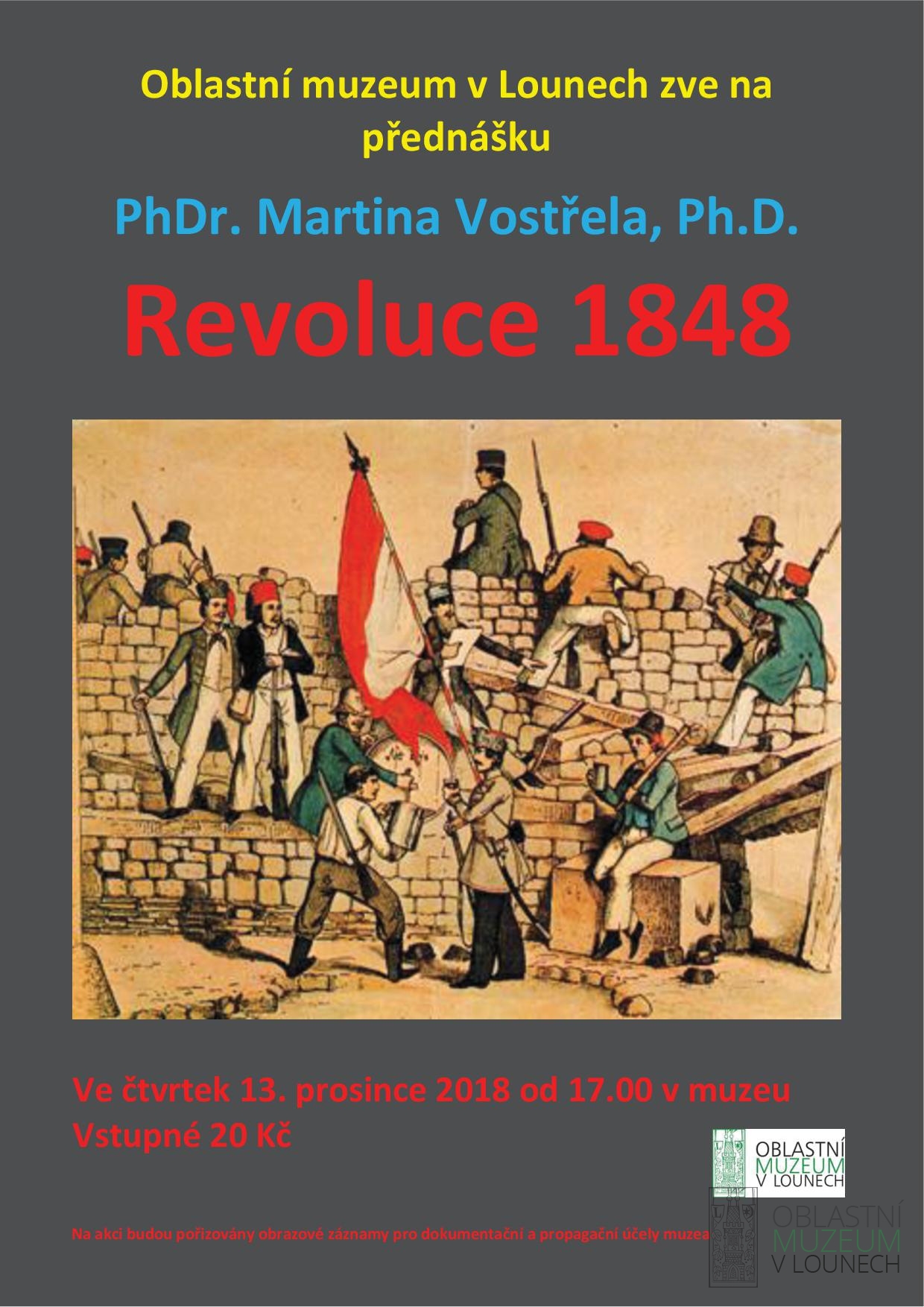 Ve čtvrtek 13. prosince se od 17 hodin uskuteční v lounském muzeu další z osmičkového cyklu přednášek. Tentokrát promluví o nepokojném roce 1848 historik Martin Vostřel. Všichni jste srdečně zváni.