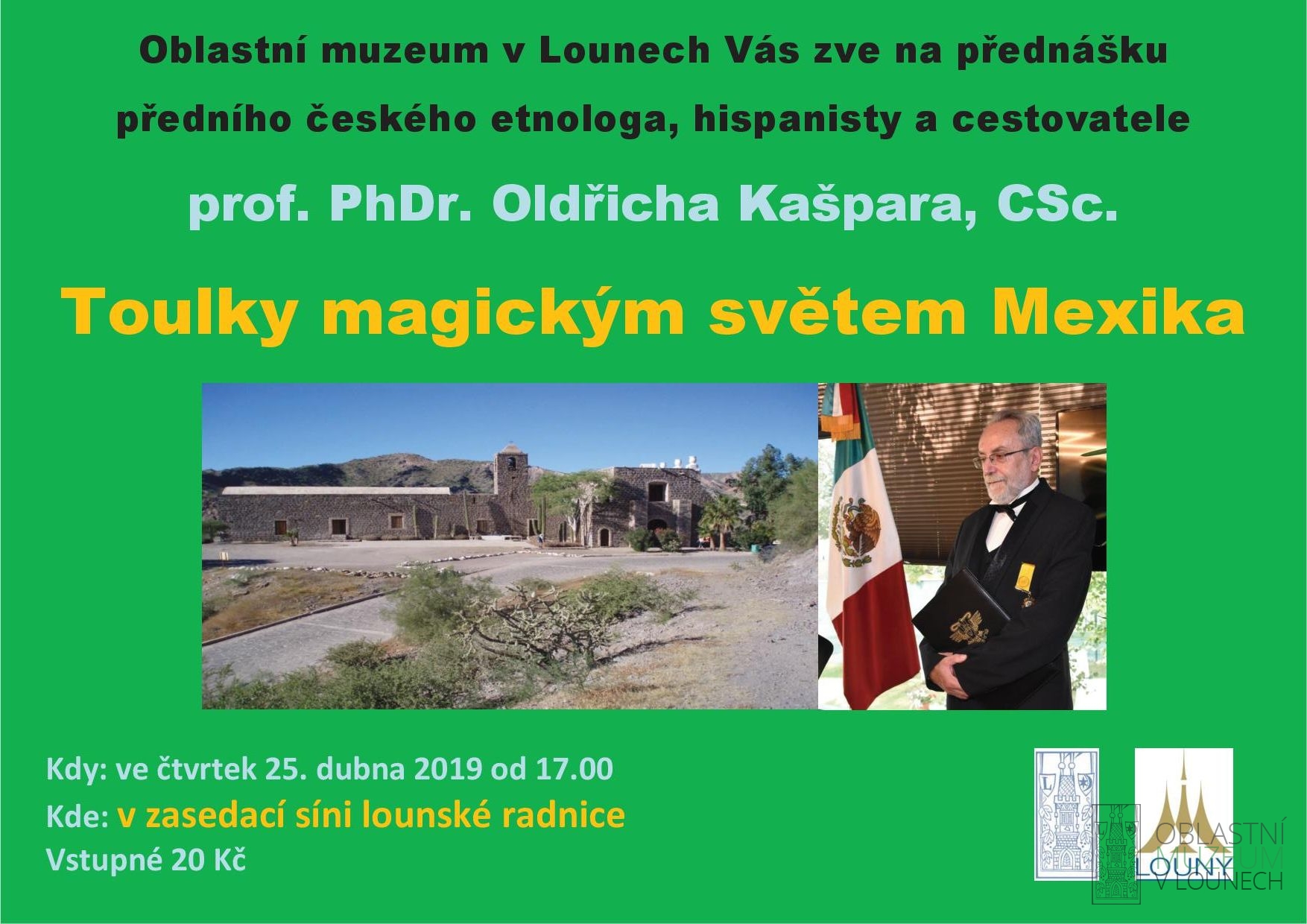 Prof. PhDr. Oldřich Kašpar, CSc. je vynikajícím českým etnologem, historikem, amerikanistou a dobrodruhem. Zabývá se také překlady poezie, mýtů a legend indiánských etnik Latinské Ameriky. V roce 2018 obdržel za své zásluhy o rozvoj česko-mexických vztahů nejvyšší mexické státní vyznamenání pro cizince „Řád aztéckého orla“. Ve své přednášce nám přiblíží Mexiko, jak jej poznal při řadě svých expedic v předchozích třech desetiletích. Vyprávění bude protkáno řadou zajímavých historek. Vstupné 20 Kč.
