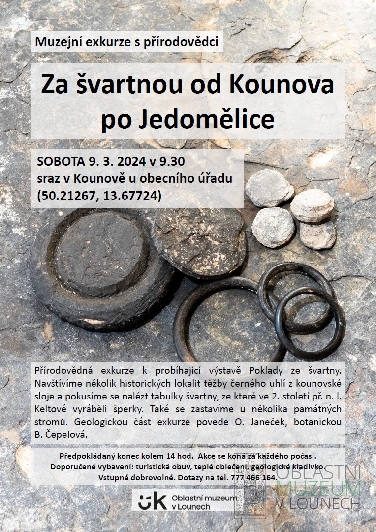 Na březnové exkurzi prozkoumáme několik historických lokalit těžby černého uhlí z kounovské sloje a pokusíme se nalézt tabulky švartny, ze které ve 2. století př. n. l. Keltové vyráběli šperky. Také se zastavíme u několika památných stromů a možná i u prvních jarních květů. Sraz je v 9:30 v Kounově u obecního úřadu (50.21267, 13.67724). Doporučené vybavení: turistická obuv, teplé oblečení a geologické kladívko. Předpokládaný konec kolem 14 hod. Akce se koná za každého počasí. Vstupné dobrovolné. Dotazy na tel. 777 466 164.