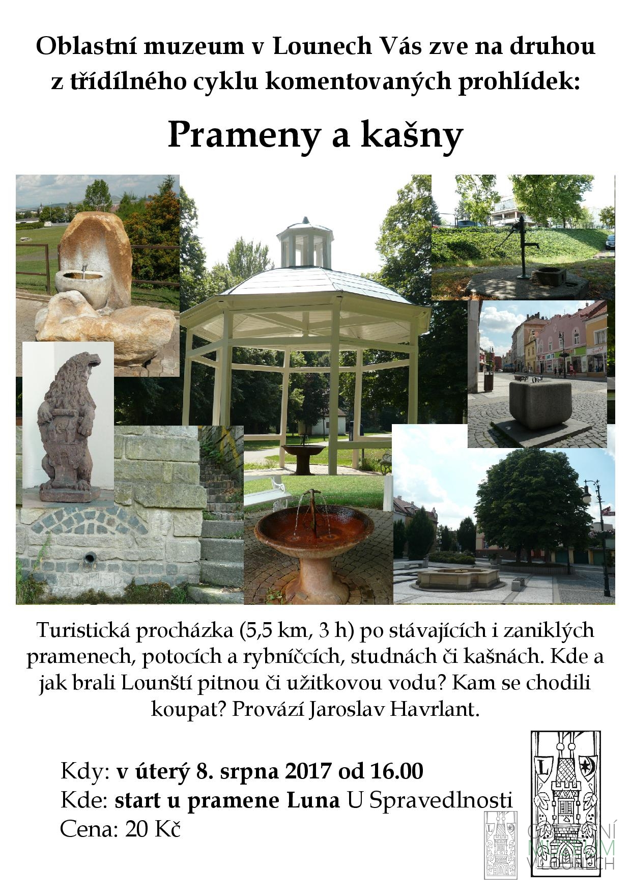 Turistická procházka (5,5 km, 3 h) po stávajících i zaniklých pramenech, potocích a rybníčcích, studnách či kašnách. Kde a jak brali Lounští pitnou či užitkovou vodu? Kam se chodili koupat? Provází Jaroslav Havrlant.