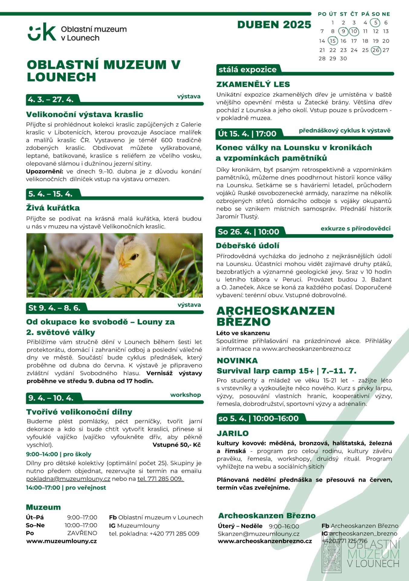 V dubnu se u nás můžete přijít podívat na malá živá kuřátka a prohlédnout si Velikonoční výstavu kraslic. Také pro vás budeme pořádat tvořivé velikonoční dílničky, kde si upleteme pomlázky, upečeme perníčky, vytvoříme jarní dekorace nebo ozdobíme vajíčka.