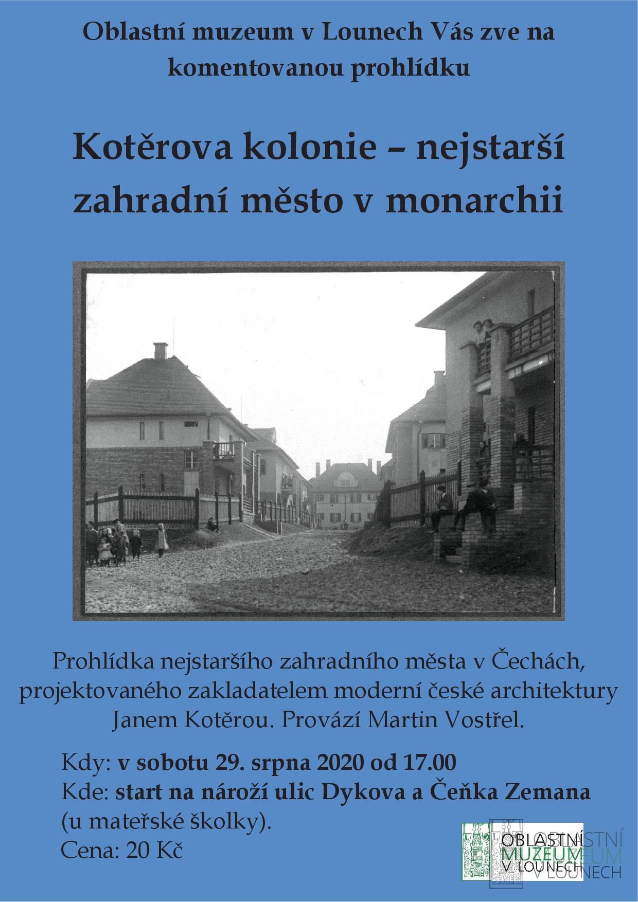 Dovolujeme si Vám pozvat na prohlídku Kotěrovy kolonie, která se uskuteční v sobotu 29. 8. od 17.00. Provázet Vás bude historik Martin Vostřel. Začínáme „U mašinek“ na rohu ulic Čeňka Zemana a Dykovy ulice.