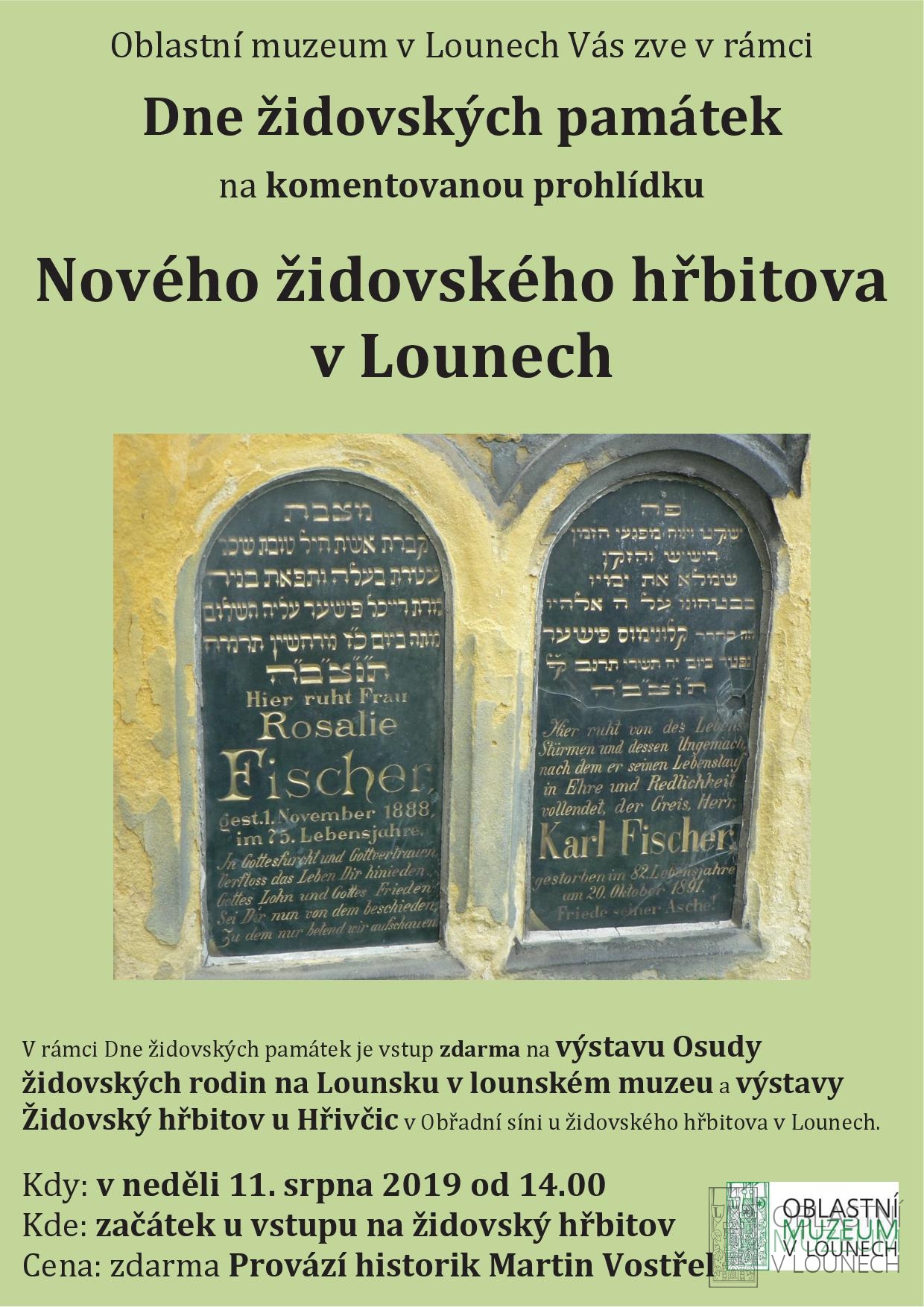 Na Den židovských památek jsme pro Vás připravili zdarma prohlídky výstavy Osudy židovských rodin na Lounsku v lounském muzeu a výstavy Židovský hřbitov u Hřivčic v Obřadní síni u židovského hřbitova v Lounech. Ve 14 hodin na Vás čeká komentovaná prohlídka po novém židovském hřbitově v Lounech. Provázet Vás bude historik Martin Vostřel.