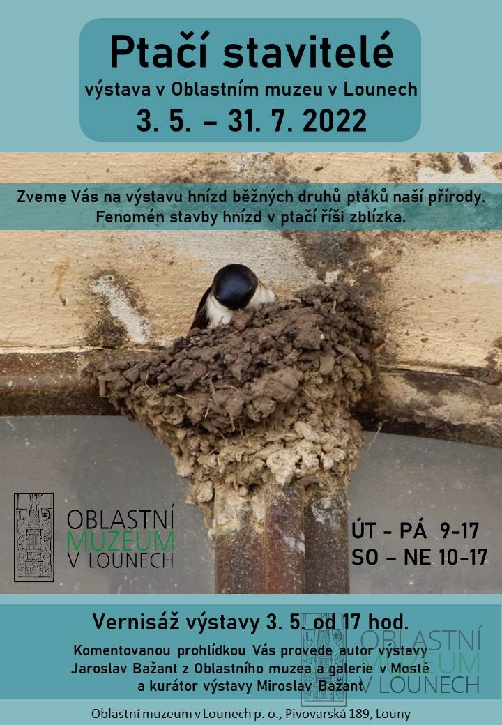 Nahlédněte do světa opeřených stavitelů hnízd. K vidění budou hnízda přibližně tří desítek druhů převážně pěvců, kteří si je jaro co jaro staví, aby přivedli na svět další generaci. Hnízda doprovodí základní informace o prezentovaných druzích včetně fotografií a další zajímavosti s hnízděním ptáků související. Vernisáž výstavy formou komentované prohlídky proběhne 3. 5. od 17 hod. (Pivovarská č.p. 189)