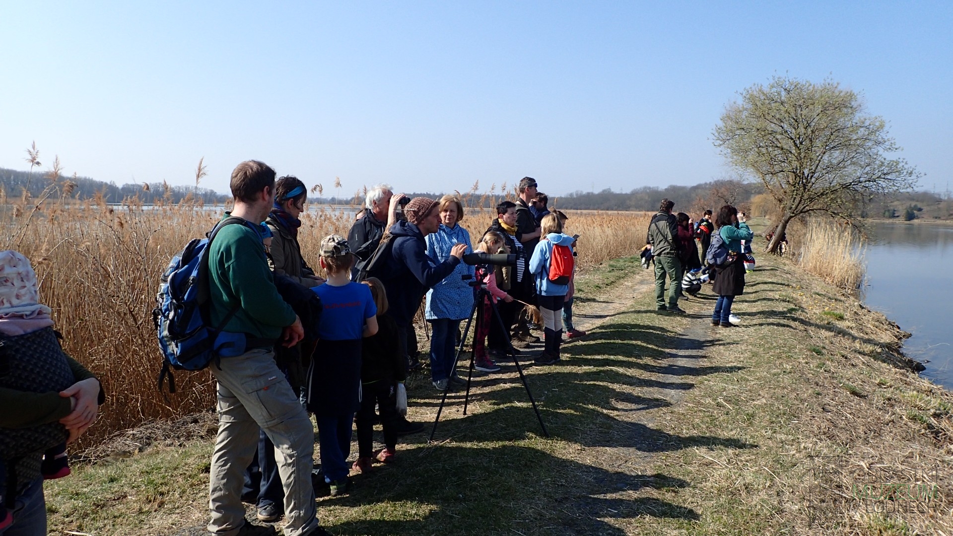 1-3 Pozorování vodních ptáků na hrazích mezi rybníky lenešické soustavy stativovým dalekohledem.