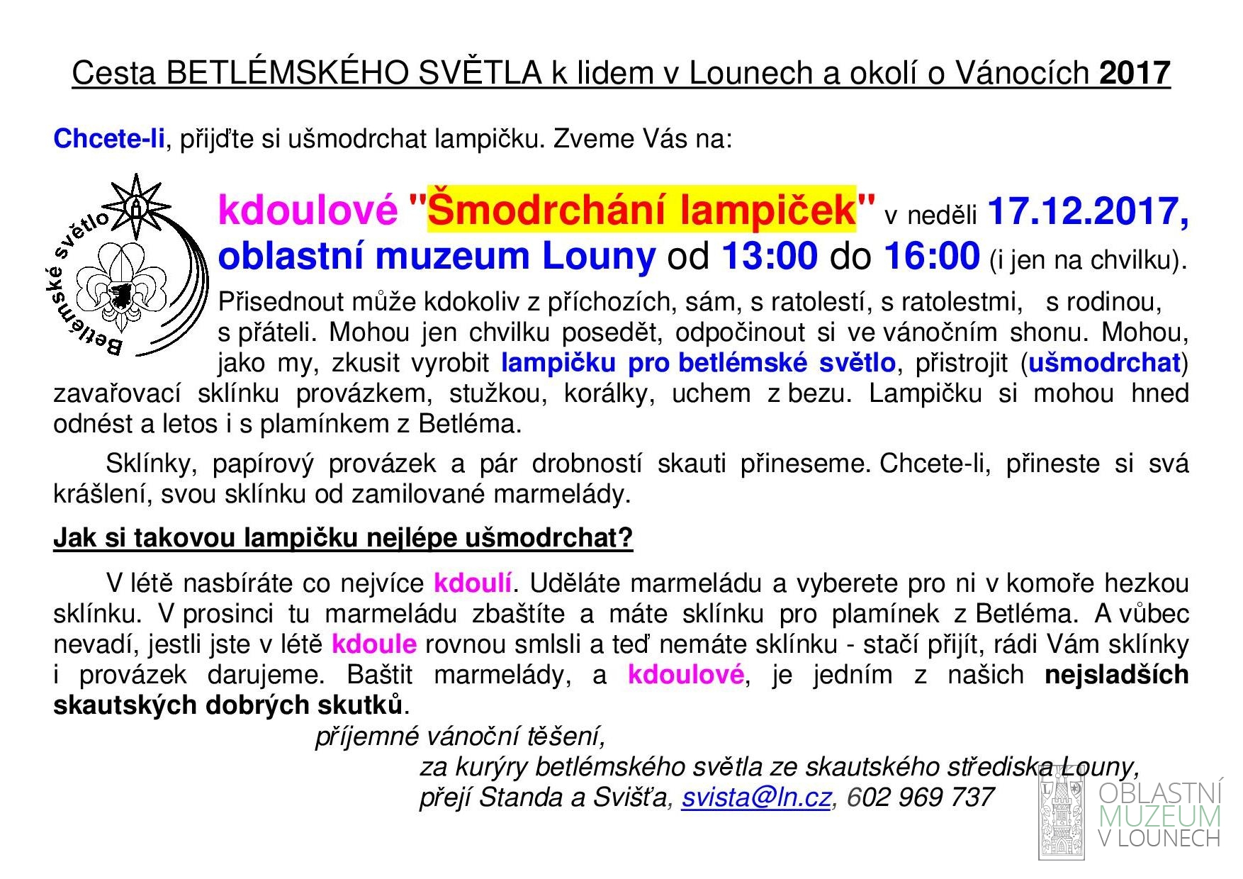 Šmodrchání lampiček je pobídka k setkání kurýrů Betlémského světla a vstřícných lidí. Můžete zkusit, jako my, přistrojit zavařovací sklínku a "ušmodrchat" tak lampičku pro Betlémské světlo, které do muzea přinesou Skauti ve 14:14. Světlo bude v muzeu po celý týden až do Štědrého dne. Můžete si ho přenést do své originální ušmodrchané lampičky nebo jen tak do skleničky, které pro Vás máme připraveny. Vstup zdarma